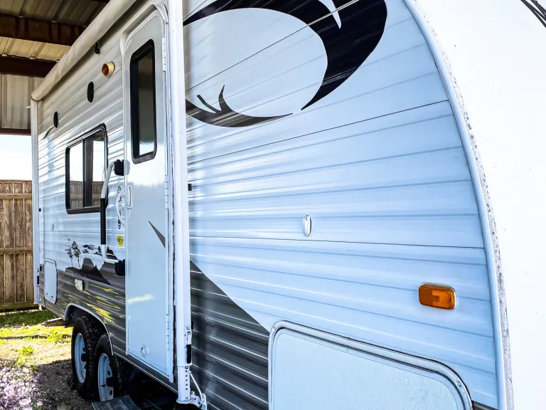Like new travel trailer with a large bathroom, full sized closet and all of the amenities you'd need for a weekend getaway! Perfect for couples or small families, this trailer comes equipped with a full kitchen and dinette, a queen-size bed and additional fold out bed, and a privacy screen that extends between the queen bed and kitchen.