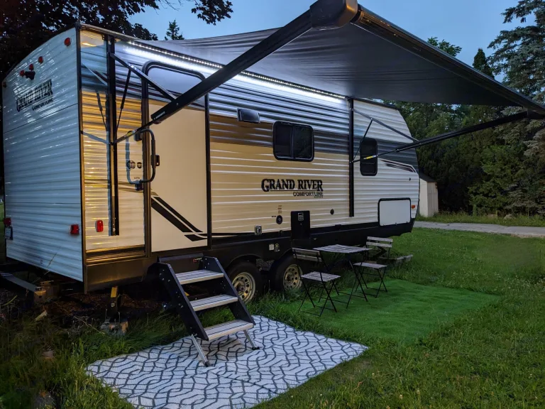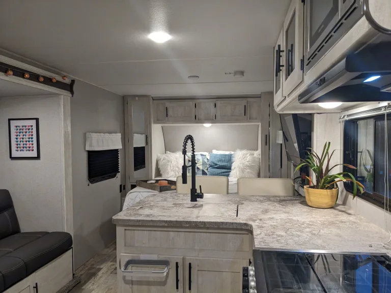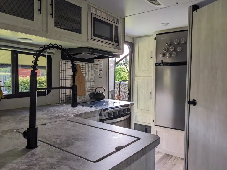 Spacious Interior: Our camper comfortably sleeps 2 adults and 2 children or 3 adults.Fully Equipped Kitchen: Prepare your favorite meals with ease using the built-in stove, oven, microwave, refrigerator, and sink.Bathroom Amenities: Enjoy the convenience of a private bathroom with a heated shower, toilet, and sink, along with ample storage for your toiletries.Climate Control: Stay comfortable in any weather conditions with efficient heating and air conditioning systems.Entertainment Options: Relax with a flat-screen TV and Bluetooth stereo system, perfect for unwinding after a day of adventure.Outdoor Living: Take advantage of the awning, a portable grill and heated outdoor shower for the ultimate outdoor experience.Why Choose Us?