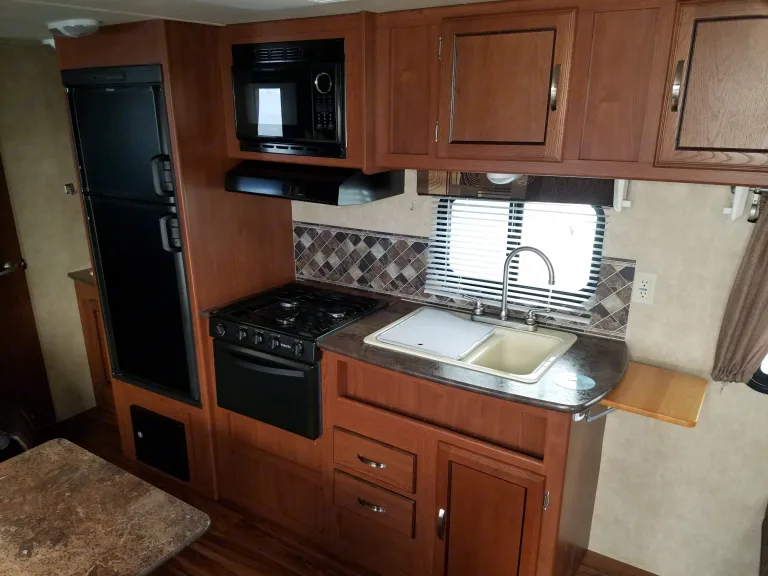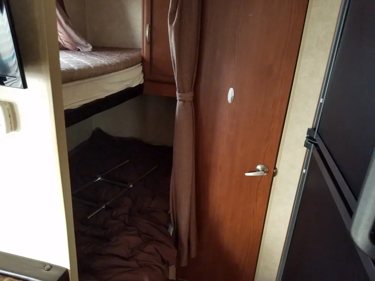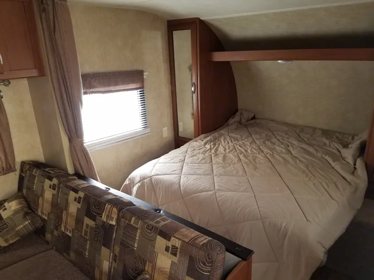 Our trailer is a great for larger groups or families. It sleeps 6-8, a bunk bed in the back that the kids will love. A queen size bed up front and the couch and dinette make into beds as well. Easy set up with power stabilizer jacks and a power awning. Full bath, full kitchen, and a tv with a built in DVD player. Outside shower is nice for rinsing off kids and propane is part of the rental price!