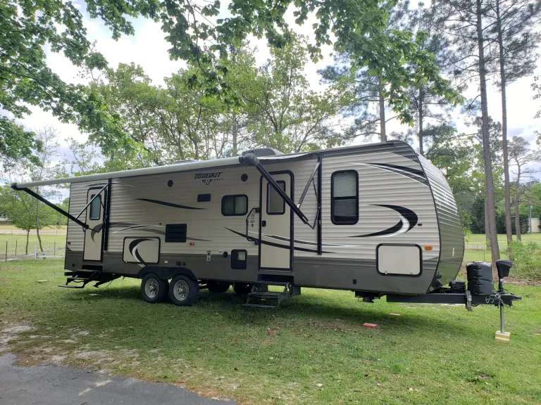All the amenities of home away from home. Make amazing family memories in our 33’ Keystone Hideout. Sleeps 8, with a queen size bed in master bedroom, two full sized bunks, a fold out sofa and fold down table.When you enter the trailer, you are greeted by an open living area with large windows that let in lots of natural light and give you wonderful views of the great outdoors. Black-out shades on all windows provide privacy and keep the light out when you want to sleep in! The slide out really creates a lot of room for everyone to move about comfortably. The entertainment center features a 55" flat-screen HD TV, DVD Player, and CD Player with stereo and both interior and exterior speakers.Directly to your right, you'll find the master bedroom with queen size bed to rest and relax in, and with a door that closes to the rest of the camper. There’s plenty of storage in the overhead shelf, his/her wardrobes, and underbed compartment. Also features a laundry chute to the passthrough storage compartment underneath.The kitchen is centrally located and features a microwave, three burner stove, oven, and refrigerator with freezer. Ample cabinet space in the pantry helps to keep things organized. That's where you'll find all the kitchenware, utensils, and pots/pans you need to prepare delicious meals for your family and guests. A spacious dinette seats 4 comfortably and also converts to a full-size sleep area.As you walk to the rear of the trailer, you'll find the bathroom with tub and shower combo, pedal-flush toilet, and sink with medicine cabinet above and storage below. It also has a second door to the exterior here so that kids in wet bathing suits can come in to use the restroom without tracking through the main part of the camper! Linens and towels not provided.The bunk area offers 2 comfortable full size sleep areas. Top and bottom bunks each have their own set of curtains for privacy, separate lights, and their own windows.The exterior features are just as exciting as the interior! A large one-touch power awning with LED lighting provides lots of shade during the day and illuminates nicely at night. Outdoor speakers let you listen to your favorite tunes or broadcast. An outdoor kitchen area with mini refrigerator and a gas cooktop completes the ultimate camping experience!For ease of set up and breakdown, the camper features power Jack and stabilizers, and comes with an Andersen leveling kit and an anti-sway load-distribution Husky Centerline hitch. We also offer delivery and set up services so all you have to do is show up!