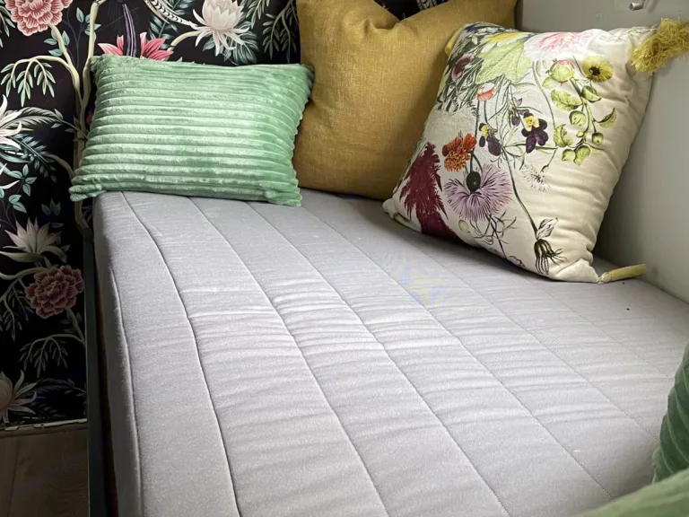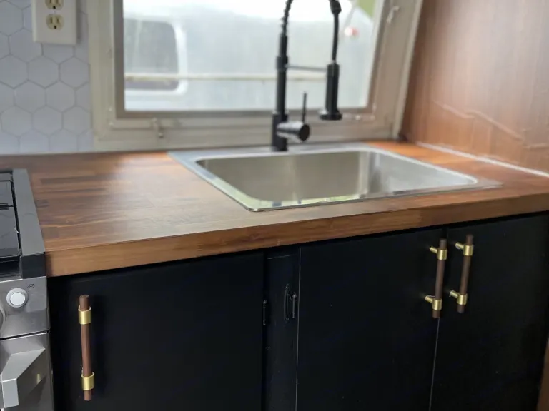 There is plenty of storage available with lots of cabinets, including two closets and can come fully stocked and ready to travel with linens, pillows, plates and more. There is an additional twin sized day bed and new bathroom with a custom shower.