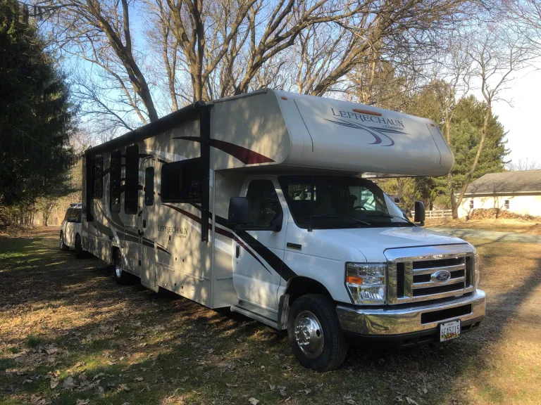 This 2020 Coachmen Leprechaun 317 SA, we named it "New York", sleeps 8 with a power awning, two slide outs – one in kitchen area and one in rear bedroom. The large bathroom has a corner radio shower with a glass door. The bath room has dual access from both hallway and the master bedroom. There is a drop-down TV in front living area, The driver side sofa is equipped with 2 seat belts and cab be fold down to a 44" x 71” bed. The large dinette is also equipped with 3 seat belts and can be converted to a 42” x 71” bed. The over-cab bunk is measured 60” x 95” in size. A separate master bed room is equipped a walk-around full queen bed (60" x 80"). This Class C motor home is also equipped with a 5.5 KW Onan generator, which can power A/C and microwave when you are not able to hook up a shore power. The overall length of this motor home is 32'.This wonderful camper is just cozy enough to keep you comfortable while hiding a great amount of storage space!