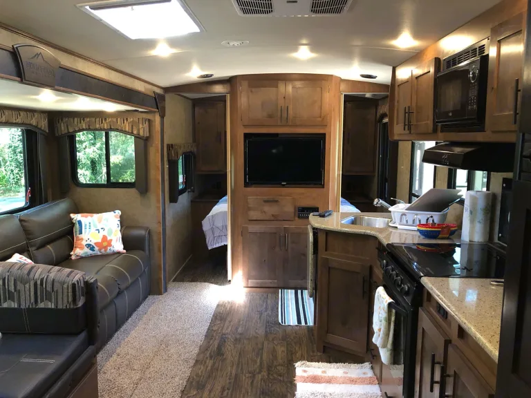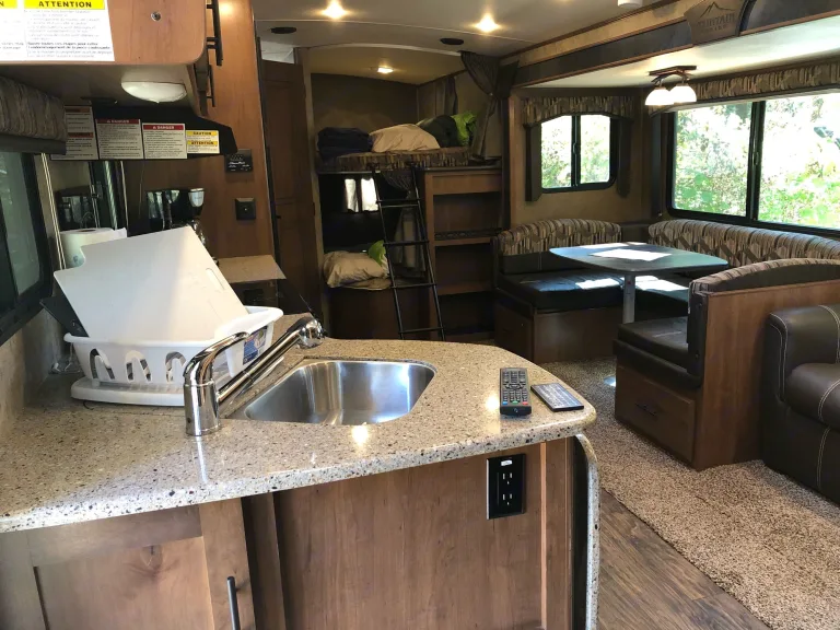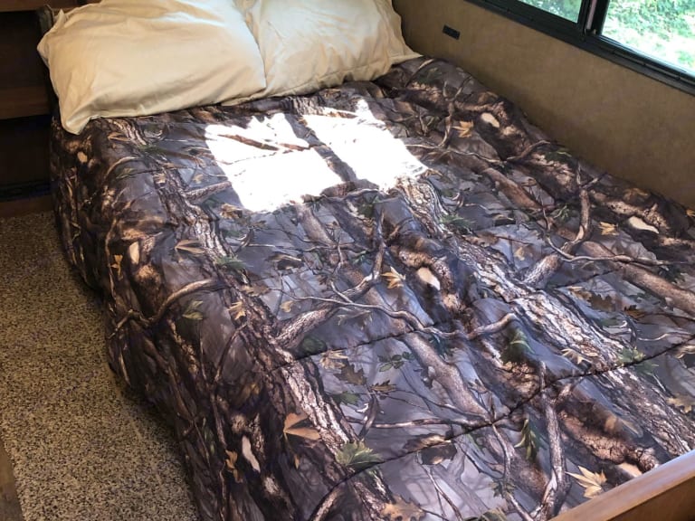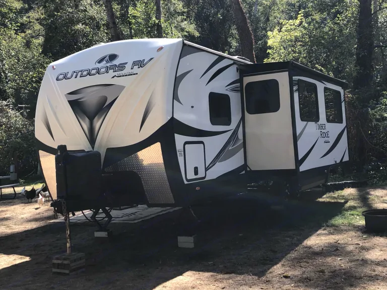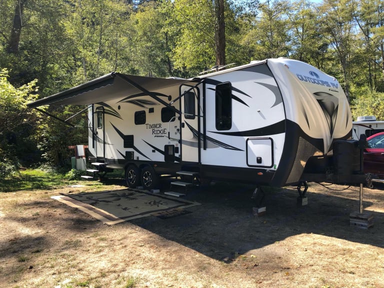 Outdoors Rv TimberRidge, can sleep up to ten people if you are putting two per bed, Two large bunks, outdoor shower, plenty of storage, flat screen tv that rotates between living area and bedroom with DVD player, radio with Bluetooth and outdoor speakers, nice electric awning with ambient lighting and much more!Enjoy this beautiful travel trailer at a campsite of your choosing! What's includedAll kitchen amenities, including coffee maker, wine tumblers and recycle bin. Camping chairs, all linens for the primary bed, along with extra sleeping bags and pillows for bunks.