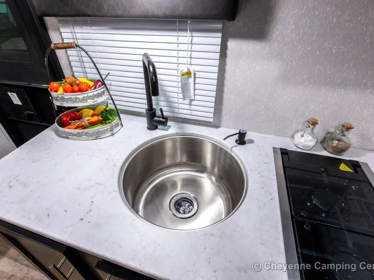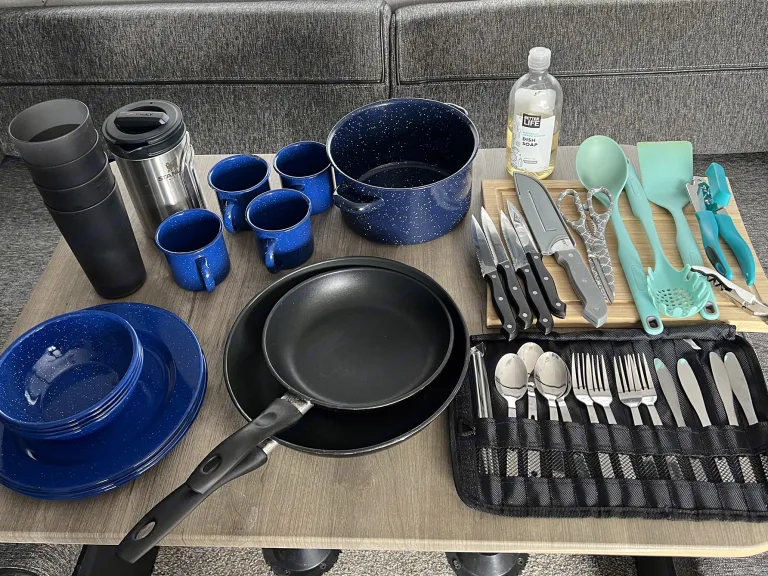 Set of 4 plates/bowls, mugs/cups, flatware, French press coffee maker, pot & pan, cutting board, kitchen shears, some cooking items such as spatula, etc.We provide a broom and dust pan as well as RV grade TP.Upgrades: