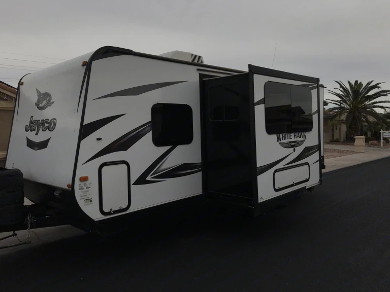 This floor plan features a pull-down Murphy queen bed, pop out horseshoe dining room with a moveable table, and a full-width sofa that gives a Great room feel. It comes with a refrigerator, separate freezer, microwave, stove, oven, with ample storage space for food and utensils. The bathroom has a full closet, drawers along with closets on both sides of the Murphy bed. The bathroom has its own sink, enclosed shower, toilet. It has an entertainment center with monitor, DVD player, stereo. Outside all the power options are hydraulic driven. The tires are all NEW 8 ply. And to top it off it has an outdoor kitchen with a fridge and a gas cooktop. You need to come and see this top of the line home away from home. If you are dry camping without hookups I have a Honda 2000 generator that will run everything but the A/C. This extra would require a reasonable additional charge. Extra amenities include an ice maker, coffee maker, ice tea maker, blender, pots and pans, and dining service for six.