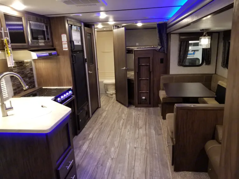 It is very modern and easy to use with all push button features. (Tongue jack, stabilizing jacks and slide out) It has two entry doors with one going directly to the rest room and other to living area. Some of the extras include- outside fridge with ice machine, outside stereo, outside shower and flat screen t.v. with satellite.