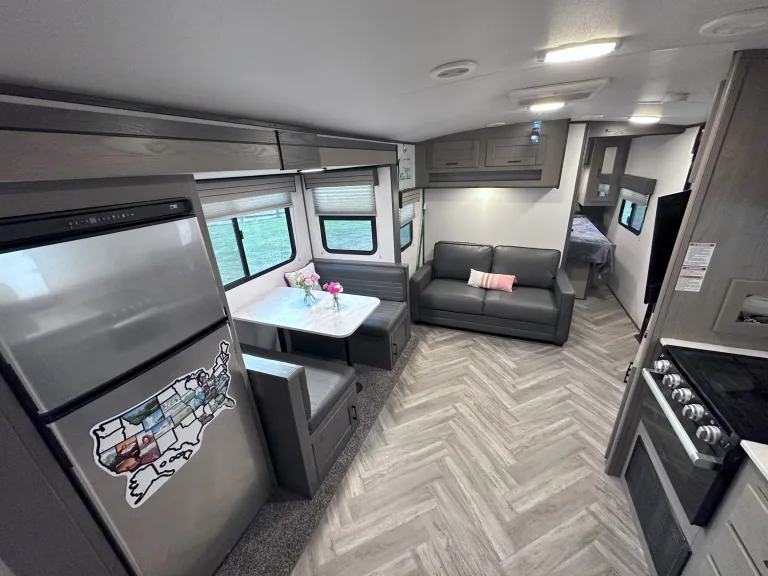 If the weather doesn't cooperate or you need a break from the heat, sit inside in the A/C or heat and cook on the stovetop, oven, or microwave. A full set of pots, pans, bowls, and utensils are included. We'll have a drawer loaded with paper plates and plastic forks as well. The 20.5 cu ft fridge inside has plenty of room for a week's worth of food. The outdoor fridge is a perfect way to keep all your camping beverages cold without refilling coolers with ice :)