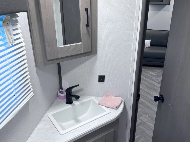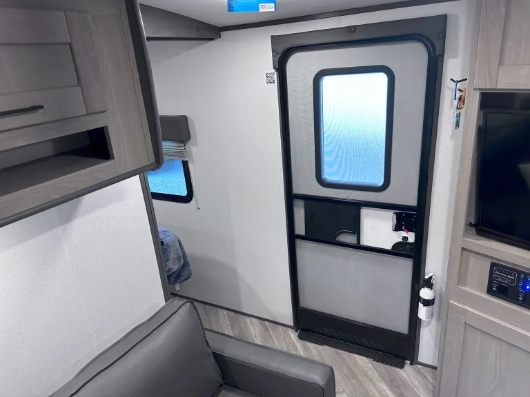 The large awning, party lights, outdoor Blackstone style griddle, and water hose with make you forget about the inside! You're camping, cook outside! Inside the storage area you'll find 4 camping chairs, an outdoor rug, citronella candles, etc. Everything you need for a campfire to remember.