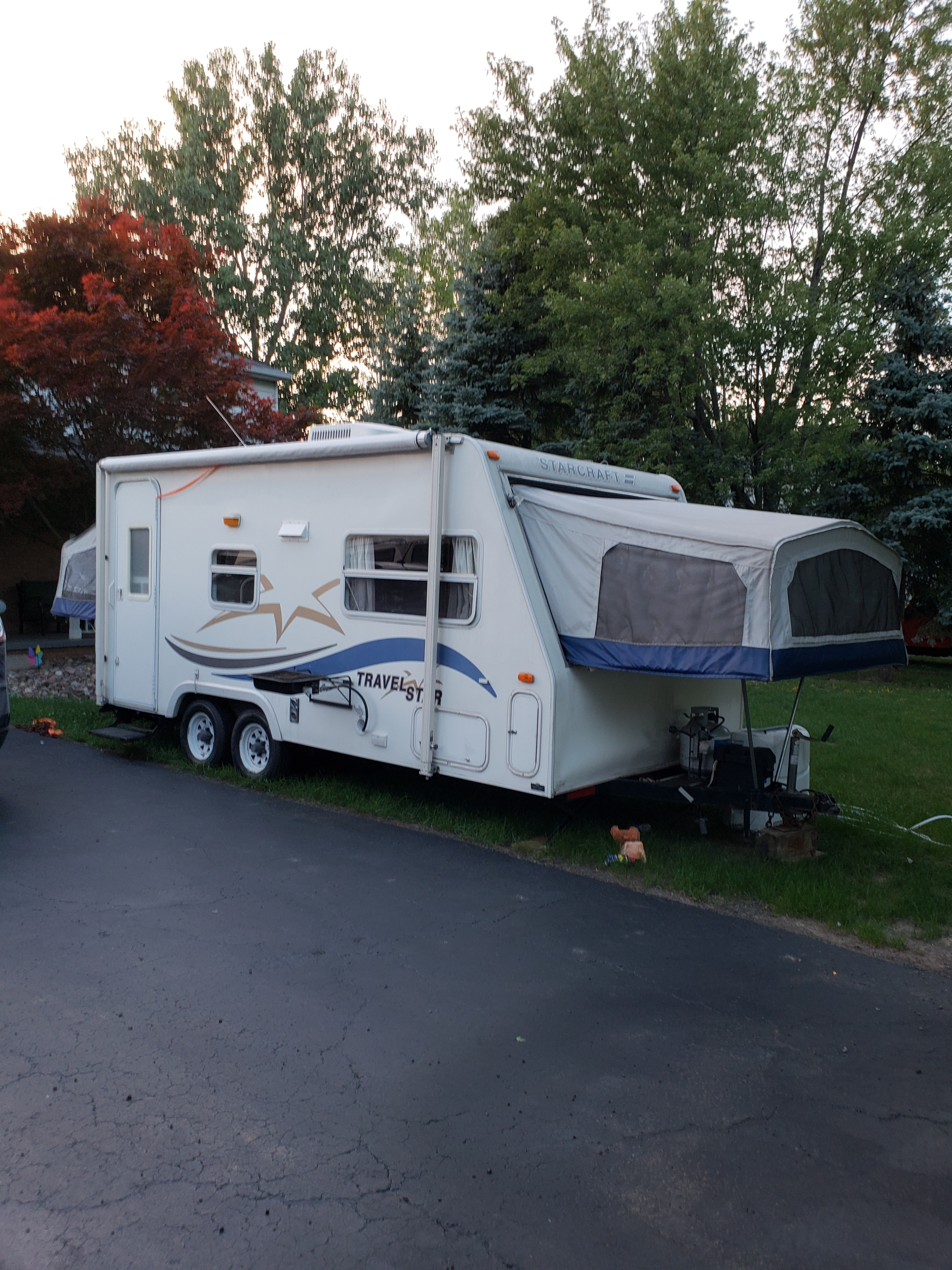2002 Starcraft Travelstar Hybrid. Very lightweight, it can be towed easily with many types of vehicles. Plenty of room for a family the unit sleeps 8 technically but those are the manufacturers numbers. I would say more along the lines of 6 comfortably unless the other 2 are children. All amenities work. Air conditioning was recently serviced and blows nice and cold.