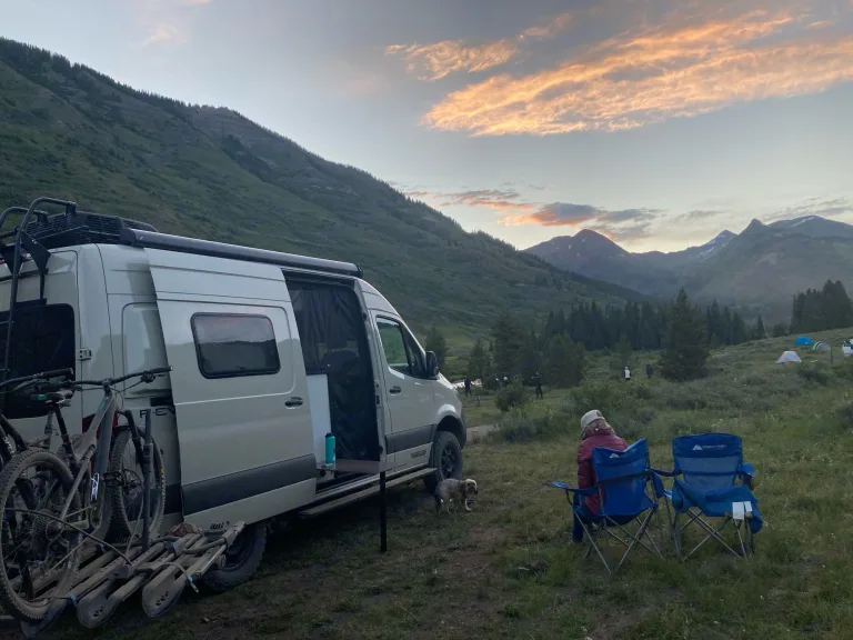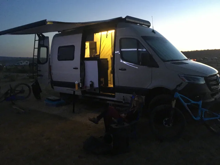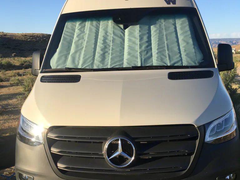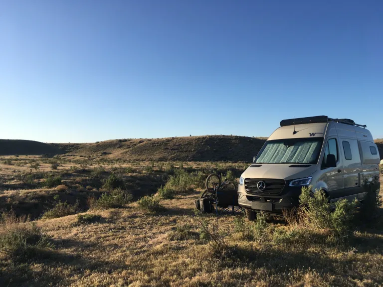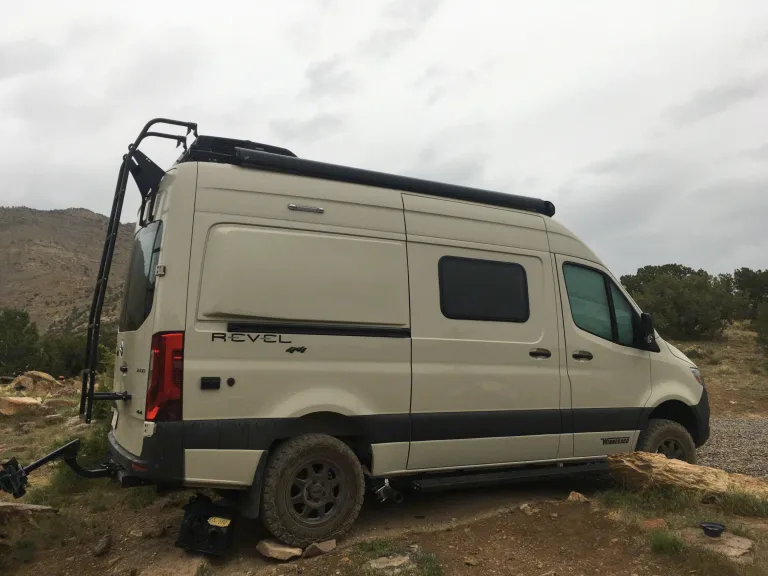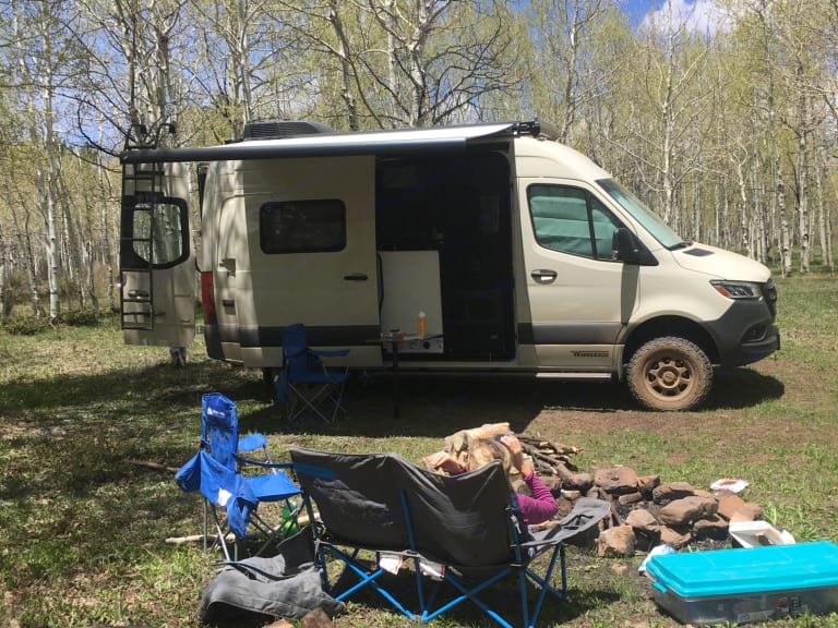 Happy Livin' is a brand new 2020 Mercedes-Benz Sprinter 4x4 campervan. Featuring Winnebago's custom Revel conversion package, this campervan has a fully equipped kitchen (sink, induction stove, fridge), bathroom (shower and cassette toilet), ventilation, air conditioning, and heater. The hydraulic bed lifts easily for storage. This van is off-grid capable for up to 3 days using solar and deep-cycle batteries. The 21-gallon fresh water tank will be filled and ready to take on your adventure. USB ports and outlets throughout Happy Livin' make it convenient for working while on the road (hotspot needed). Pivoting front seats provide additional comfortable seating in the living area while parked.Happy Livin's Mercedes Benz cab is easy to drive with Bluetooth capability, back up camera, and cruise control. This van drives more like a large SUV than a RV. The 3.0L 5-cylindar, 188h-p turbo diesel engine along with 4wd capability will get you up a mountain pass, down a dirt road, or into a tight parking spot.Live that van-life! An electric awning, outdoor lights, and a outside table make the perfect Happy Hour atmosphere after a long day of exploring. A 4x bike rack included with rental on request.Check out this link from Winnebego showing off the Revel: