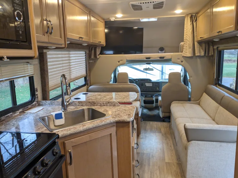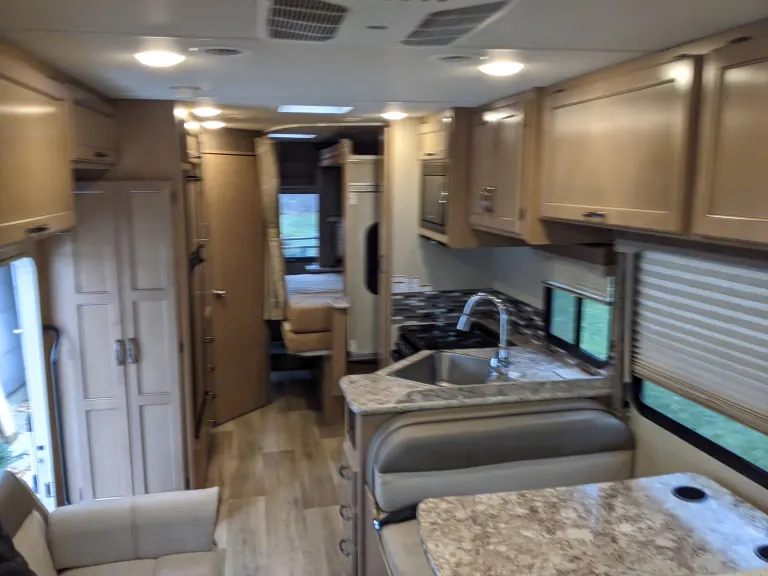 [URL removed]The interior is designed with family in mind. You’ll notice easy-to-clean residential vinyl flooring so that clean-up time won’t detract from your adventures. Easy clean-up is a must-have, especially when you have a kitchen where you’ll want to cook. Plus, it’s scratch-resistant, so you never have to say goodbye to your four-legged family member!This Class C kitchen has everything you need. The double-door refrigerator has enough space for all of your ingredients, and the pantry has extra storage.Bedding: This Freedom Elite has a queen-sized bed slides out to sleep 2. The dinette folds down to sleep 2. An over-the-cab bunk queen-size bed sleeps 2. The fold-out couch sleeps 1 or 2.
