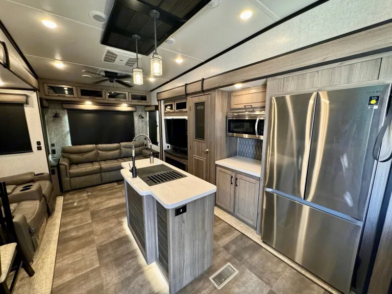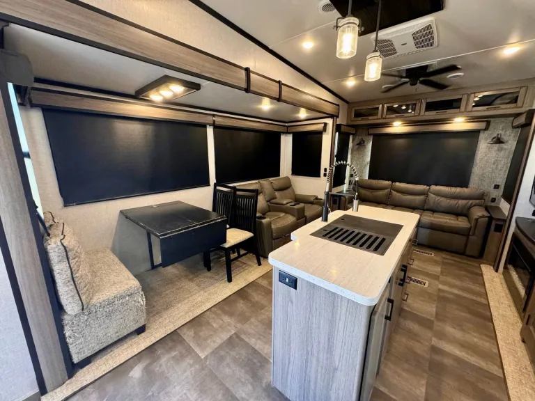 This 40-foot Cameo fifth wheel offers a spacious, open living area with four slide-outs that create an incredibly roomy interior. The king master bedroom features a fireplace and a smart TV, making it a perfect retreat for relaxation. The master bath is large and luxurious, providing comfort and privacy. The expansive living and kitchen areas are perfect for gatherings, with plenty of space to entertain or unwind. This fifth wheel offers the perfect combination of luxury and functionality, ideal for use as a green room or mobile retreat.