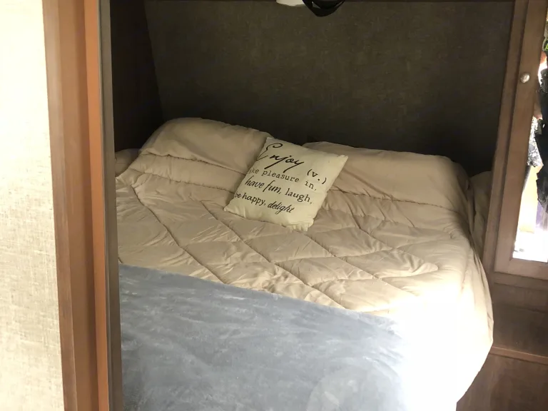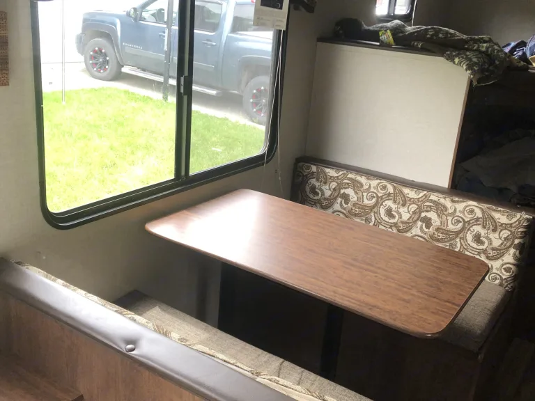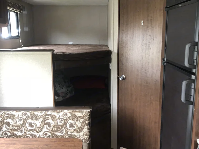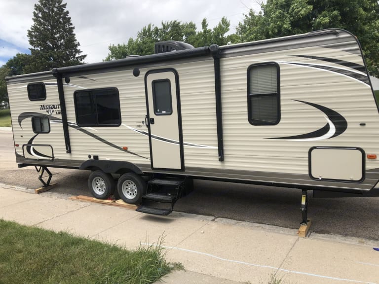 outside, reading material, flashlights, and more. We want you to enjoy your trip and so anything else you need just ask.Our camper has only been used for one camping season. Everything in the camper works. Enjoy sitting outside with the Bluetooth radio and lighted awning, or sit inside and play a game of cribbage on one of our custom Montana Made cribbage boards.The camper sleeps six adults comfortably, and up to 8 people if there are kids. There are double sized bunks, a table fold down bed and couch bed in the main area. It also has a closed door bedroom with a full sized bed.The camper comes with a stability hitch for easy travel. The max weight, fully loaded is 7500lbs. It comes with the tanks full. You can choose to empty them upon your arrival, or have us do it for a fee.Depending on where you are traveling to, we might be able to set up and deliver the camper, as well as pick it up.Enjoy the best that Montana has to offer in our little home away from home.