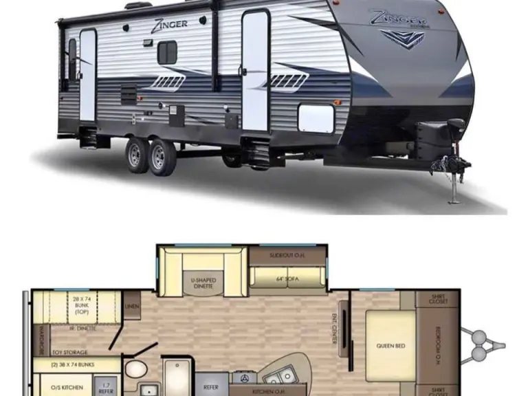 Discover the ultimate home-away-from-home experience with our Crossroads Zinger rental!Perfect for families, couples, or groups of friends seeking adventure, this spacious and luxurious RV offers the perfect blend of comfort and convenience on the road. Step inside to find a welcoming interior complete with all the amenities you need for a memorable getaway. Whip up delicious meals in the fully-equipped kitchen, relax in the cozy living area, or unwind in the private bedroom featuring a comfortable queen-sized bed. With additional sleeping accommodations including bunk beds and convertible dinettes, there's plenty of room for everyone to rest and recharge after a day of exploration.Outside, embrace the beauty of nature with the ZR 290KB's outdoor kitchen and entertainment area, perfect for al fresco dining and enjoying the great outdoors. And with easy towing and maneuverability, you can hit the road with confidence and ease, ready to embark on your next adventure. Whether you're planning a weekend escape or a cross-country journey, our Crossroads Zinger rental offers the perfect combination of luxury, versatility, and affordability for an unforgettable RV experience.Book your rental today and start making memories that will last a lifetime!