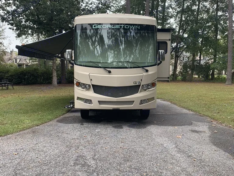 2020, like new (3000 miles), Forest River Georgetown GT3. All essentials included: Bedding, pots, pans, silverware, plates, bowls, cooking utensils, dish-cleaning soap, paper towels, toilet paper, etc. Tons of storage space. Master bedroom with a full-size bed. Drop-down bed over drivers/passengers seats. The dining table area converts to a bed. 3 TV's: One in the living room, one in the master bedroom, and one outside with speaker for Music and TV. Outdoor shower. Sway bars. V-10 Ford Engine. All of the upgrades. $135k RV with less than 1000 miles on it.