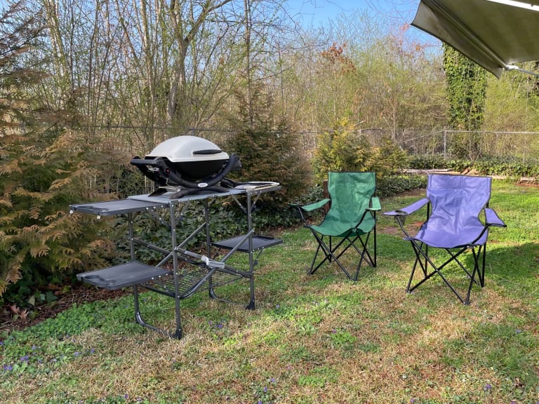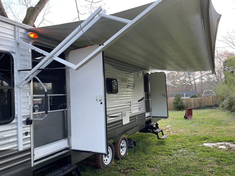 Outside the camper is a 20’ awning with LED lights to enjoy the nightlife! The radio/CD player plays inside the camper as well as outside for entertaining. We supply grilling and camping accessories, 2 fold-up camp chairs, and a cooler for your convenience. RecommendationsThis camper is available for full 30A hookups. Primitive/boondocking camping is allowed and 4000W generator is available to rent. Fresh water tank is 45gal, gray/black tanks 26gal. Whenever possible it's ideal to use the campground restrooms to eliminate filling up the wastewater tanks if there are no sewer hookups available at campsite. We have a 28 gallon, portable wastewater tank available to rent if needed.Other things to noteWe only ask that you leave the camper as you found it. We love dogs and cats, but please, no pets in the camper. And no smoking in the camper. Any damage due to pets, smoking, or flooding due to negligence of emptying wastewater tanks when full will result in renter losing their security deposit.