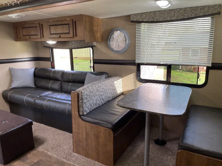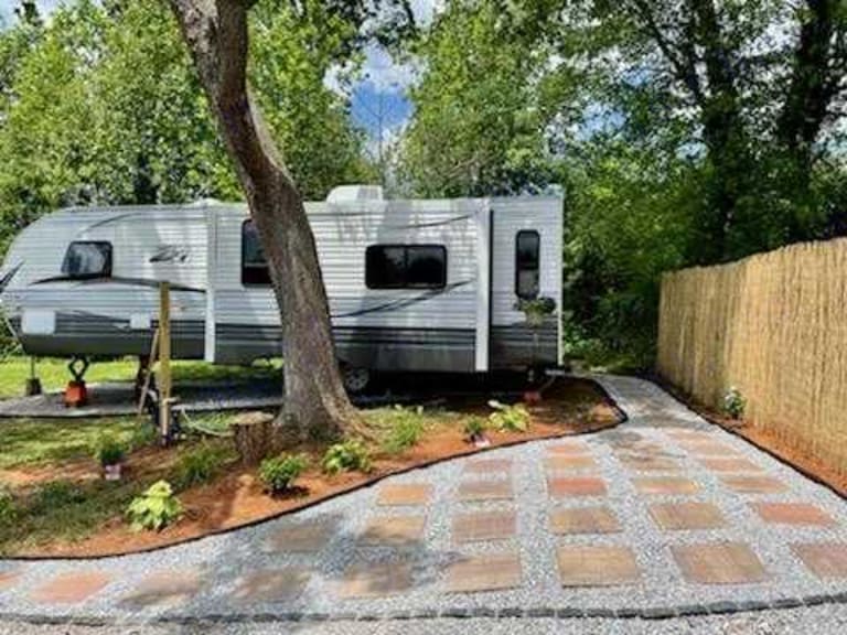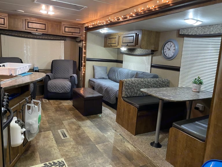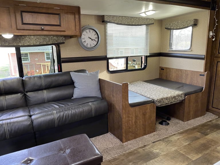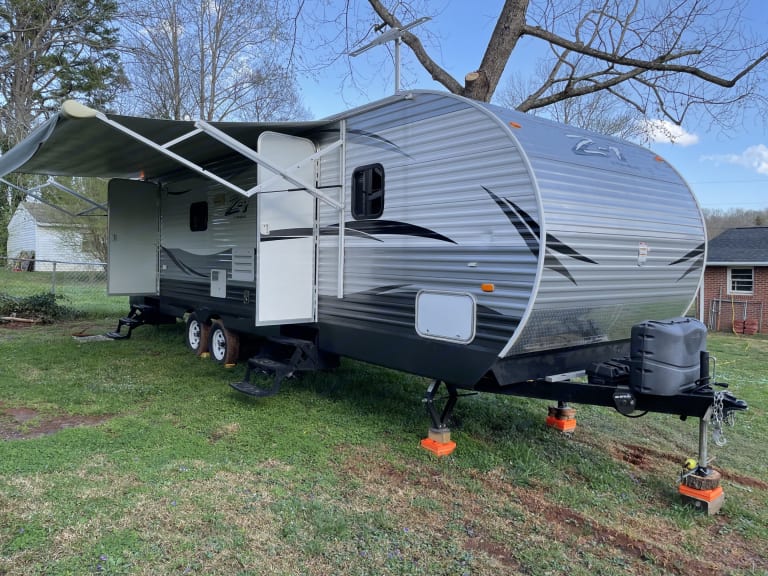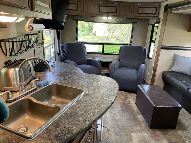2016 Z1 Travel Trailer fully stocked and ready to go to your campsite or private property to provide extra space for visiting family! Plenty of room for everyone to be comfortable while exploring fantastic campsites in and around the Greenville, SC area. RV has all the amenities of home. This is a large camper with plenty of room to move about and tons of storage for your belongings. Sleeping arrangements for up to 4 adults and two children include a very comfortable Queen-size memory foam bed, a fold-down futon-style sofa, and a dinette table that converts into a sleeping area for children. The kitchen comes fully stocked with dishware, pots and pans, utensils, children's dinnerware, coffee maker and filters, toaster, essential spices, a refrigerator, stove, oven, and microwave. Relax outside with our two camp chairs, a small Weber grill with BBQ utensils, a 12' awning to cover you from the sun, a cooler to keep your drinks on ice, while listening to the music from the stereo system that plays both indoors and outside! We supply bed linens, extra pillows, and blankets, bath towels, shampoo and conditioner, soap, toilet paper, paper towels, cleaning supplies. We strive to fully stock and provide all the little comforts of home to make your stay enjoyable. Lastly, we keep our camper clean! We follow the strict guidelines for cleanliness by washing everything in between guests, sanitizing everything, airing out, and buying new supplies for each guest as needed. If there are any special accommodations you need please let us know in advance and, if we can, we will try to have them available for you.What's includedThis camper has a very spacious living room floorplan provided by the large slide-out. Flat-screen TV in the living room and a sound bar for amazing sound! Soft and cozy string lights are draped across the slide-out for a warm ambiance feel! Dual recliners and a futon-style sofa. We provide extra pillows and blankets for guests. The kitchen is equipped with a 1000W microwave, 3 burner propane stove, propane/electric conversion refrigerator, coffee maker, toaster, pots and pans, dishes, utensils, and some spices for cooking. A breakfast nook with bench seats converts into a small bed for the kids! The bathroom has a walk-in shower, sink, toilet, vent fan, and a skylight. We provide soap, shampoo, and towels. Finally, after a long day, you will love the quality memory foam queen bed, so very comfortable! The walk-around bed has closet space on each side for your clothes. The Smart TV allows you to link into your favorite apps so you can lie back and watch your favorite shows!