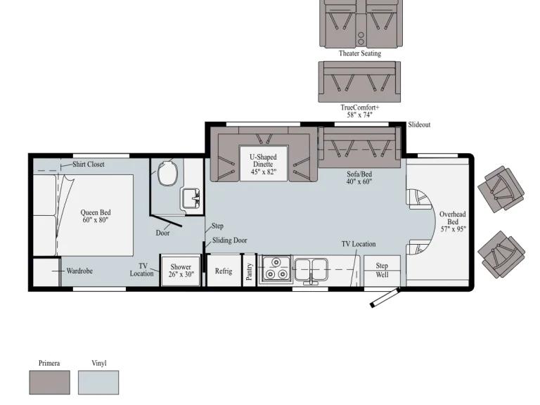Our RV is brand spanking new with lots of latest technology and amenities with a modern style. Included 2 outside chairs for your use. Rv will be sanitized before each use.