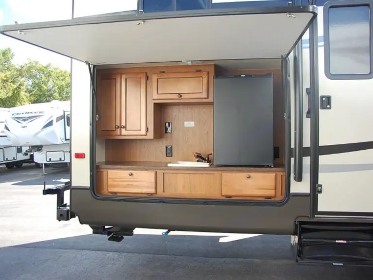 The 31 BH floor plan features an outdoor kitchen with BBQ station, refrigerator, sink and cabinets. Inside the unit the kids will enjoy the kids bunkhouse located in the back of the trailer with sofa, flip down bunk, built-in bunk and built in entertainment center. Mom and Dad will enjoy the privacy of the main living area with sofa and dinette with features such as the two way swivel fireplace and entertainment center that allows the fireplace and or TV viewing from the bedroom or living room area. Includes BBQ, outdoor table, rug, 4 outdoor chairs and is fully equipped and ready for your next adventure.