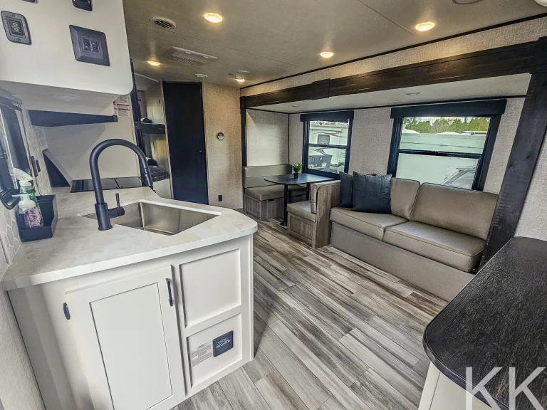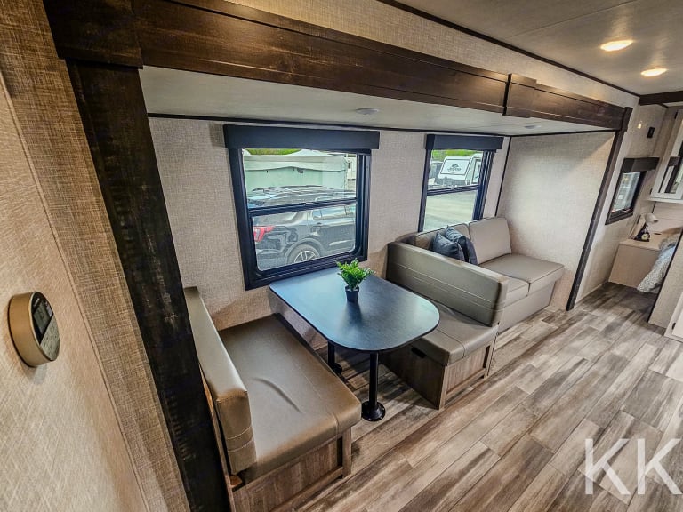 2024 26BHS Open RangeIntroducing the brand new 2024 26BHS Open Range 30’ travel trailer, perfect for your family's glamping adventures! This meticulously maintained trailer offers an array of features to enhance your outdoor experience. Outdoors, you'll find a spacious 16ft powered awning, outdoor speakers, a convenient outdoor mini fridge with storage, a propane BBQ hookup, and ample storage space. Indoors, enjoy the comfort of a queen bedroom with separation doors, double bunk beds, a convertible dinette, and a jack-knife couch for additional sleeping arrangements. The fully equipped kitchen includes a fridge, freezer, stove with oven, microwave, double sink, cupboards, and a small pantry. With 1 slide-out providing extra space, this trailer is perfect for families or couples on the go. Plus, we've got you covered with all the essentials including mattress covers, towels, crockery, cooking utensils, coffee maker, water boiler, and griddle. Add dry-cleaned bedding and pillows for ultimate comfort for 55$. For entertainment, enjoy indoor/outdoor Bluetooth speakers and a TV. Outdoor amenities include an outdoor fridge and shower, as well as a 16’ awning with LED lights.Please note, that a propane refill charge of $80 is applied to every booking to ensure you're always prepared for cold mornings and nights. A minimum 4-night stay is required for bookings with delivery and pick-up.Coordinate pick-up and drop-off times ahead of booking acceptance, with a Renter return time must be by 12 pm (unless otherwise agreed upon) or late fees will apply ($80 from 12:30-3 pm & $125 from 3-9 pm). Experience the ultimate in comfort and convenience with our Open Range travel trailer!Specifications:Weights
