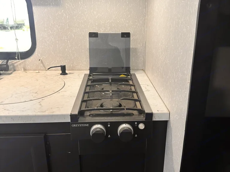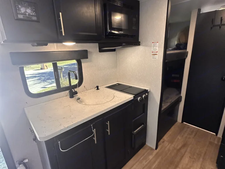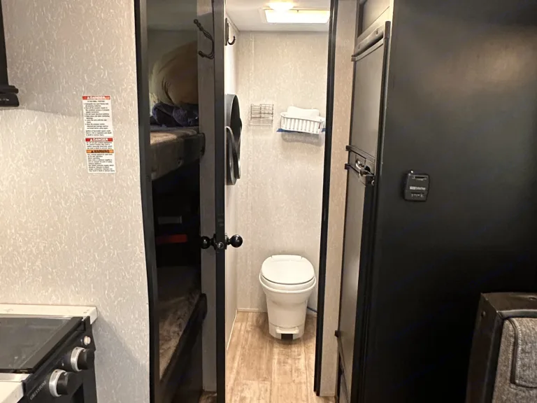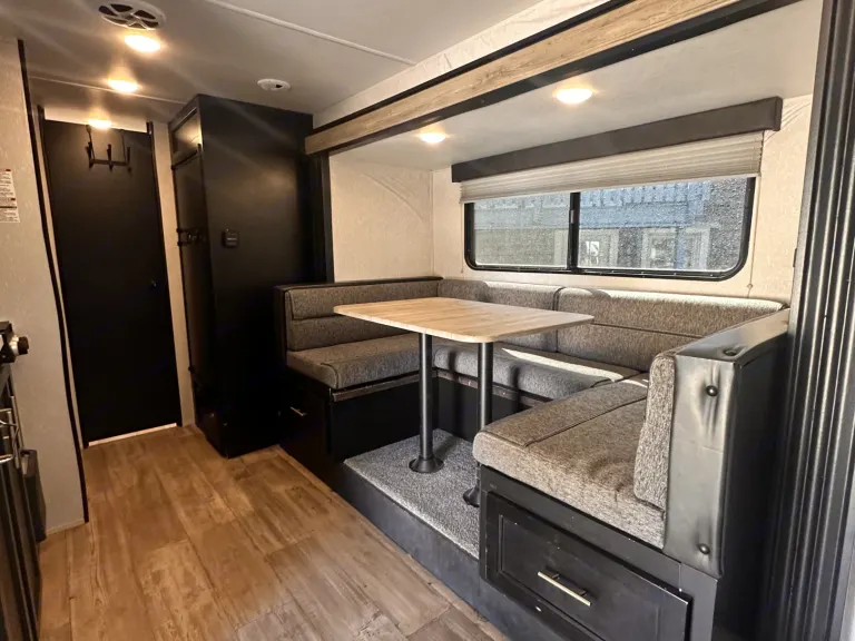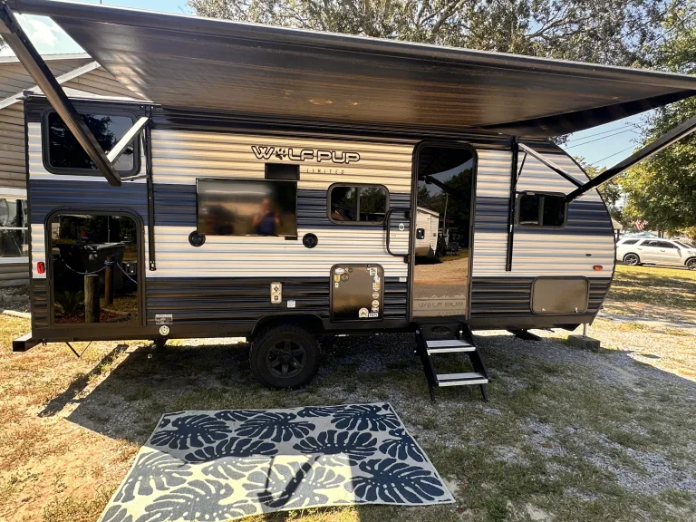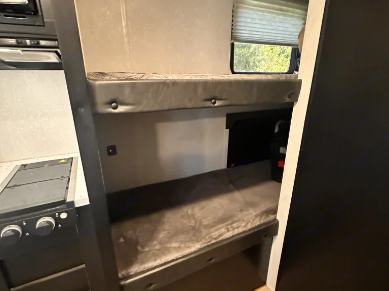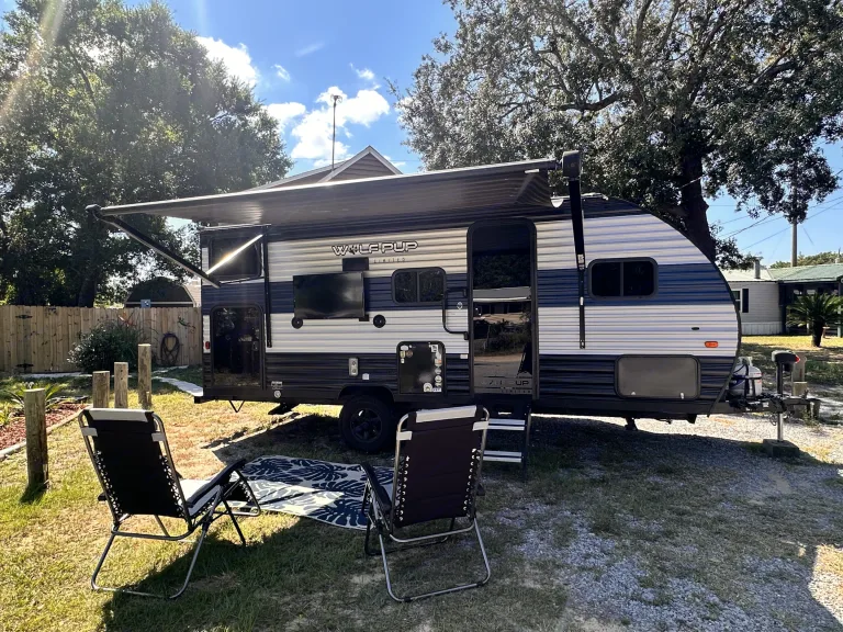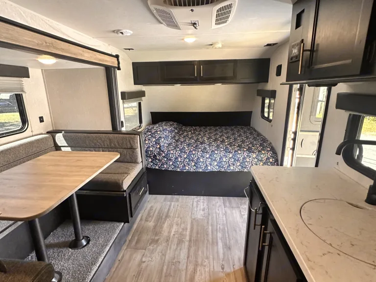 Includes everything you need to camp! Queen bed and 2 bunks in the back. Dinette makes into a bed if needed. Outdoor TV! Small outside refrigerator! Free delivery and pickup with a 7 night rental.What's included• Dishes,coffee maker, sheets, towels, chairs, pots and pans, silverware. Everything you need to camp with no additional charge.Other things to noteNo smoking.