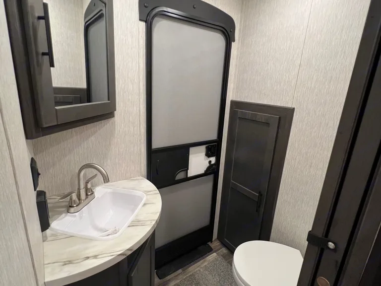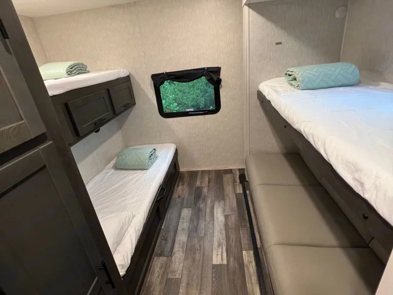 A pristine camper awaits your perfect getaway with all the comforts of home! An open concept living and kitchen floor plan provides an open and spacious feel. Lots of counter space, lots of cabinets with lots of storage, range and microwave makes cooking feel just like home. Has pots and pans and utensils included. Comfortable leather love seat that turns into bed. Table that sits up to 7. Smart Tv for entertainment that you can use your hot spot. Master Bedroom with King bed, 2 small closets with extra cabinets, and plentiful windows for outdoor views. Full bathroom with Large shower. Also has a half bath with sink and toilet. 2nd bed room with 3 twin bunks and also large leather couch that folds out into an over size twin bed. 2 slide outs ensuring a spacious interior. Storage underneath Camper. 1 large awning provide excellent outdoor living space! Outdoor kitchen with sink, gas grill, and small fridge. Excellent air conditioner and heater keeps temperature comfortable no matter what the conditions are outside. RV sleeps 8 comfortably. Has tankless water heater! All clean lining is included. Hope you enjoy!What's includedIncludes clean linens, towels, 2 rolls of toilet paper, 1 roll of paper towels, kitchen utensils with pots and pans.