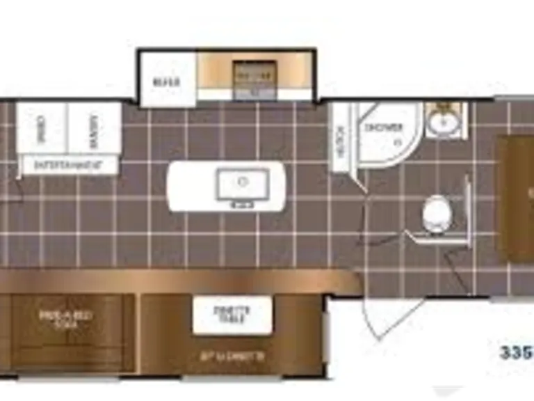 This Lacrosse 335BHT travel trailer features a rear bunkhouse, an outside kitchen, a kitchen island, and the "must have" features continue.As you enter the trailer, there is a full bath straight ahead. The side aisle bathroom has a corner shower, sink with medicine cabinet above, and a toilet. Plus there is a second sliding door into the bath from the bedroom.In the front bedroom you will find a queen bed with shirt closets on either side of the bed and overhead cabinets above the bed.Heading back to the main living area there is a slide with a u-shaped dinette and hide-a-bed sofa along the curb side wall. An entertainment center is across from the sofa for easy viewing. Along the road side there is a slide out including a three burner range, counter space, overhead cabinets, and a refrigerator. In the middle of the kitchen you will find an island with a sink for easy clean up and extra serving space. Plus there is a hutch and pantry opposite each other completing the kitchen area.The rear bunkhouse has a slide with a sleep & play on the bottom with 13" T DVD combo and a bunk above. On the wall across from the sleep & play area there is a bunk above storage.If you enjoy cooking outside, the outdoor kitchen will come in handy. There is a two burner cook-top, refrigerator, sink, counter space, and overhead storage, plus a swing out mounted Gas Grill and much more inside and outside!