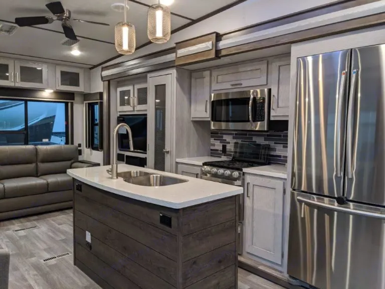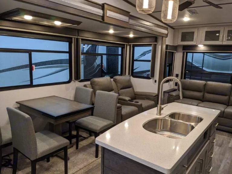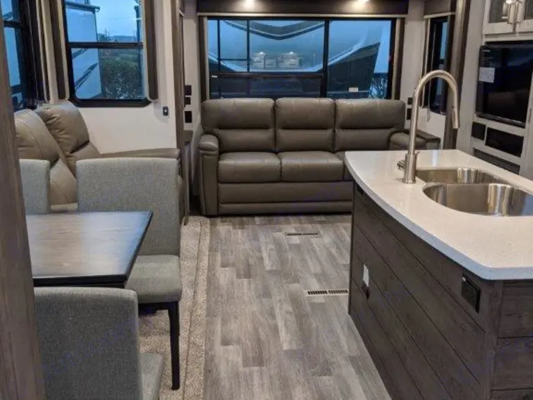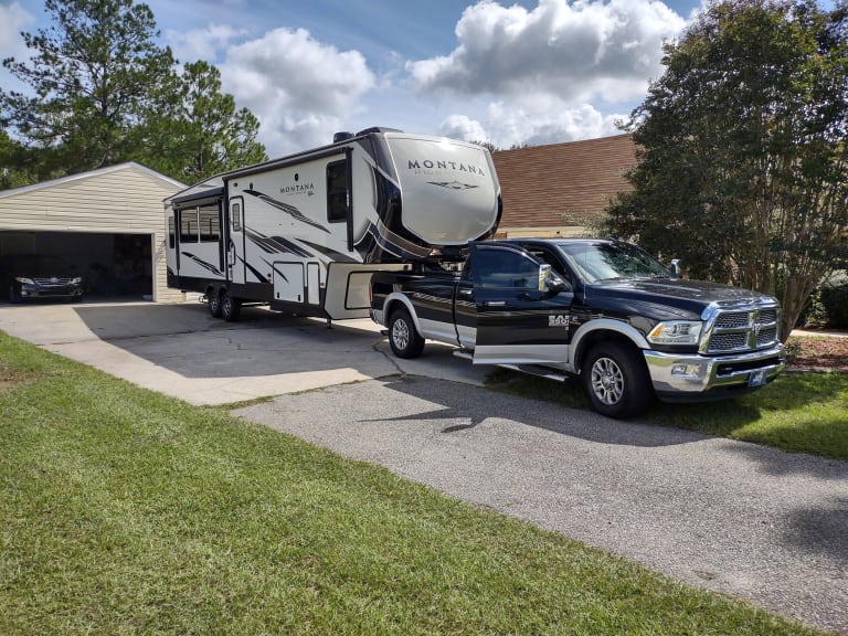 Newer and beautiful rear living coach with pantry and residential size double fridge. Living area has fireplace, TV and entertainment center. Lots of cooking and meal preparation space. Lots of storage in and outside, King size bed with "walk-in" closet and TV in bedroom. Sofa pulls out into a double bed, There are 2 very comfortable recliners to sleep, Dinette that extends with 4 chairs. Full size shower with double sink in bathroom and ceramic toilet. There are two awnings for outdoor living.What's includedCamping chairs, fold up table, clean/fresh linens, dinnerware, charcoal grillRecommendationsJekyll Island, Hanna ParkOther things to noteSmall pets welcome: < 15 pounds.