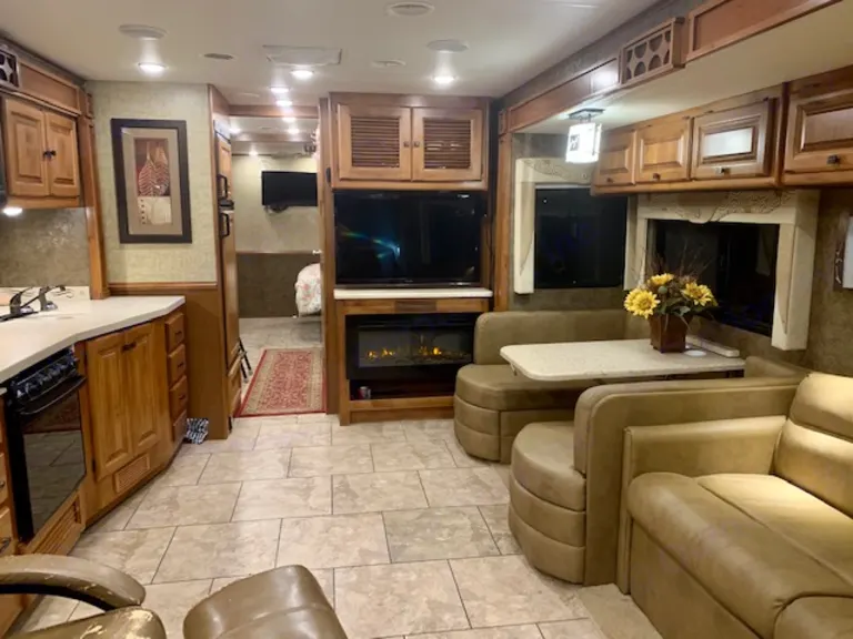 It is a unique and fun way to take families on their RV trip. It is a Luxury Class A with a very large living area. 2 AC units keep you cool and comfortable, plus a very cold unit engine unit. As well she has a fireplace with pretty cool color changing features, two central heating units in case you get cold.She drives great with the larger 22.5" wheels, upgraded shocks (Koni), rear Sumo Springs to soften the ride, and a steering stabilizer to make driving it straight smoother. Tires are less than two years old as well.It is fully loaded with all things you would need on a trip except food, beverages, and clothing. It sleeps 7-8 people. Perfect for a large family or a few people that want plenty of space to have fun. Opposing slides in the living area offer tons of room just where you need and want it most. Central vacuum, 2 thermostats, a microwave, and a gas oven/range are some of its features. There are also 3 flat-screen TV's (bedroom, living room and cab Plus the outdoor entertainment area with a TV. Sleeping: Queen Master (2), Bunkhouse has 2 RV singles with 2" memory foam toppers (2), Full-size Sofa spring/air mattress (2), Dinette (2). Seat-belts for 5.This home on wheels comes with everything you need. All bedding including towels, coffee pot, all kitchen supplies, BBQ, Griddle, and Even RV toilet paper is provided in this rental. There is plenty of storage inside and underneath.NON-Smoking Units! NO Exception.