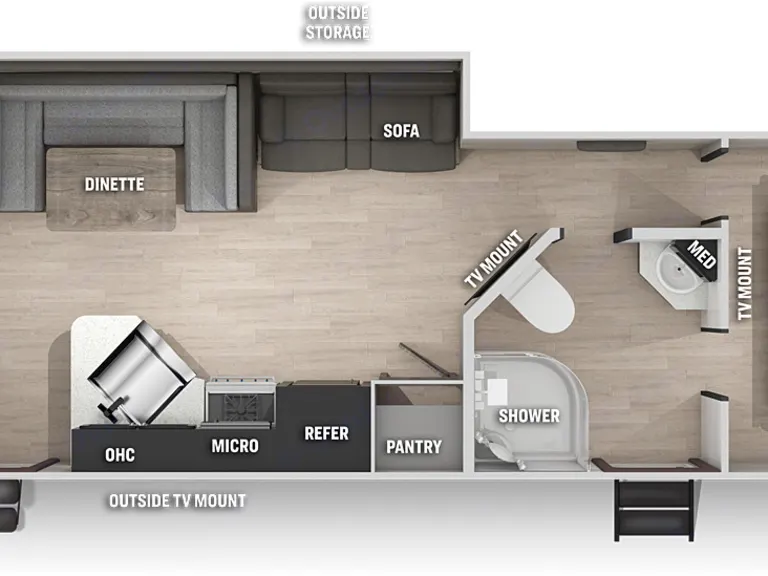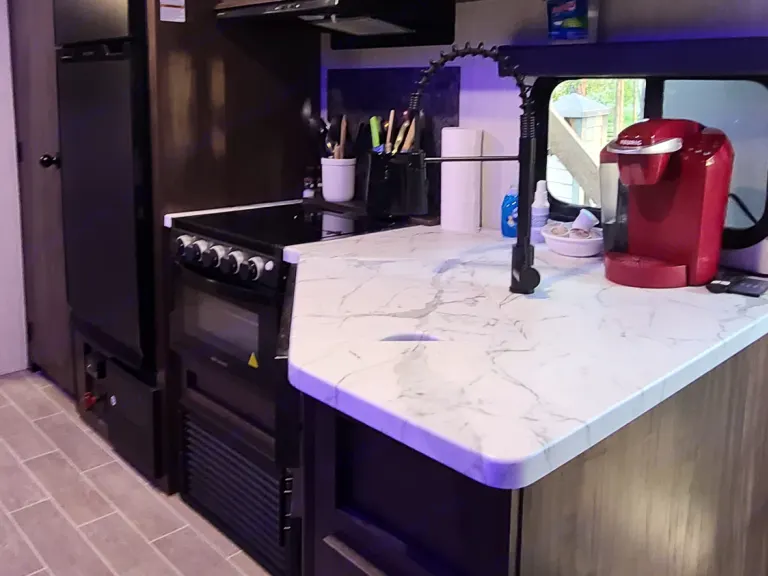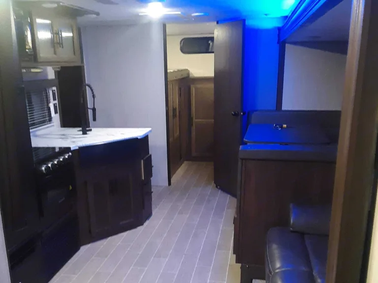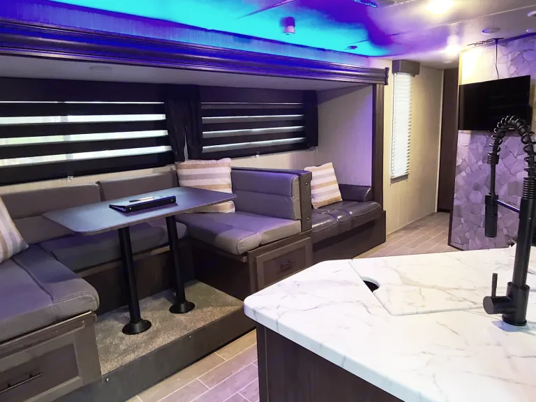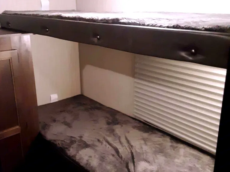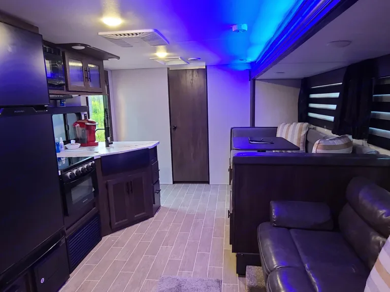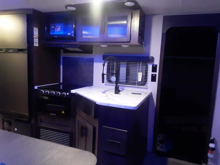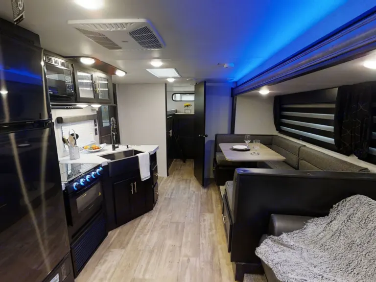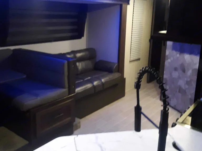 Everything you need! As fresh and convenient as a nice hotel with the cozy comfort of a cottage. This camper has a bunk room for kids or guests and a separate queen bedroom. For extra sleeping space, the living room couch converts into a bed as well as the dining table area. 1 bathroom with a standup shower. Outdoor shower. The kitchen has a gas stove and oven, a microwave, refrigerator, and freezer. Kitchenware included. Want to cook outside? This camper has an outdoor kitchen with fridge, freezer, ice machine, sink with hot & cold water, and pullout burners for cooking. SO much more that you just have to see!What's includedThis camper is your home away from home with a Keurig coffee maker, fresh clean linens, and complimentary toiletries.
