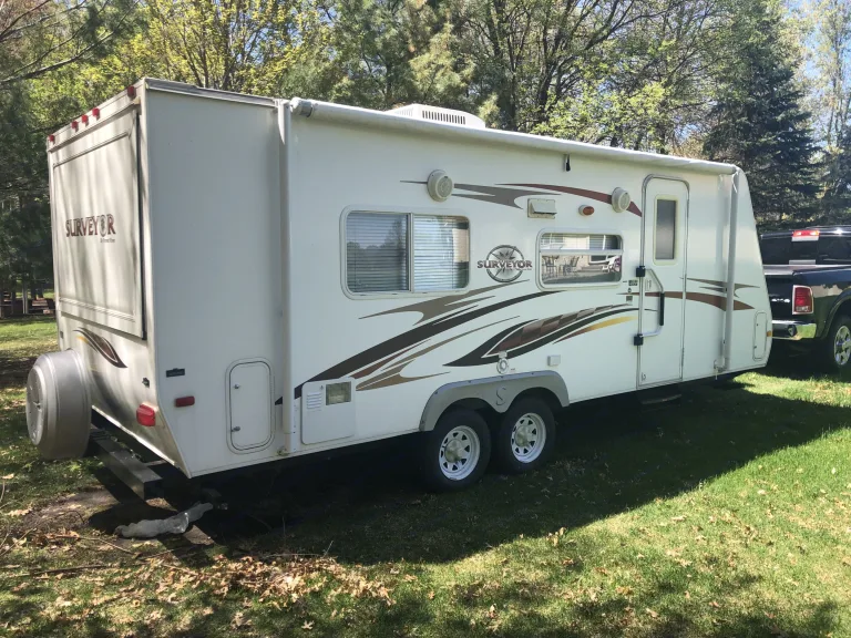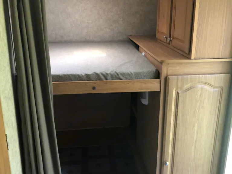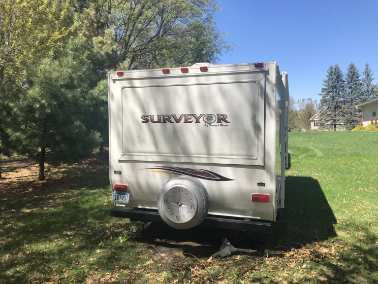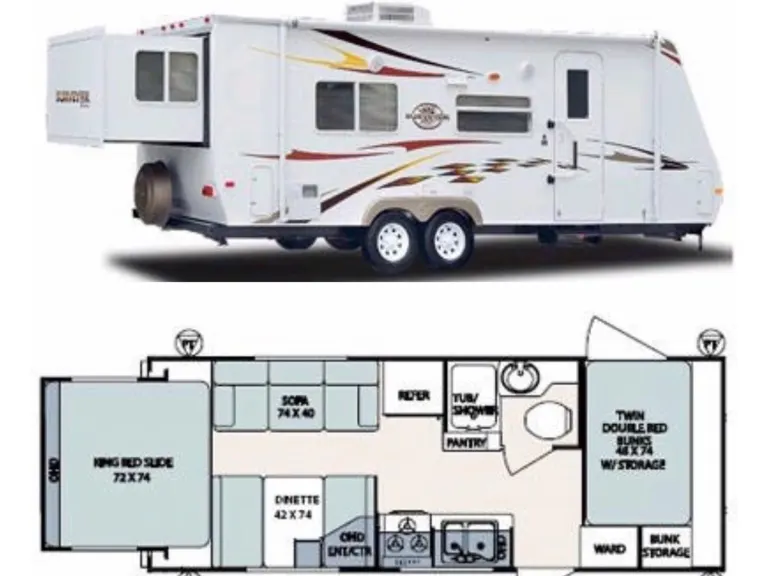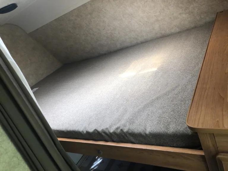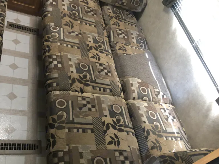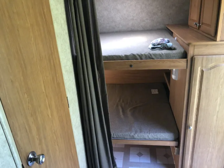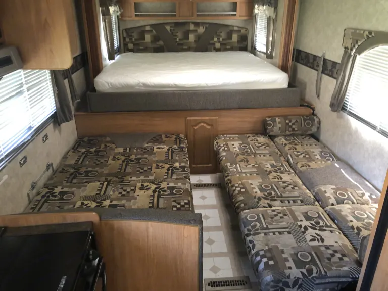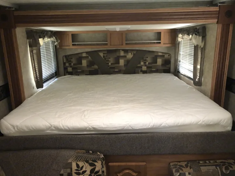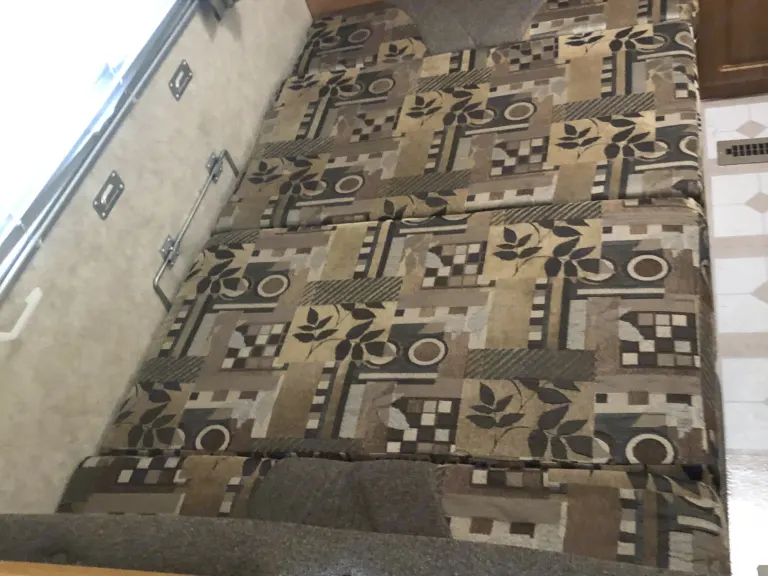 King size bed bump out, 2 full size bunk beds in front, couch and table fold into additional beds. Sleeps up to 10 people, also great for a couple wanting to get away. This is a great compact design, but fairly spacious. Lots of sleeping space, as well as a functional design that allows for a comfortable experience. Plenty of storage space for bikes and other fairly large items. There are 2 propane tanks, a stove and oven, microwave and a refrigerator and freezer. We recommend a generator that is at least 3500 to run all appliances efficiently. Air conditioner keep the entire camper nice and cool, even on really hot days. The king size bed is comfortable and can sleep up to 3 people. This is a great rig for a family wanting to get out and enjoy the great outdoor spaces we have here in the Midwest. If you have any questions, please feel free to contact us. Thanks!