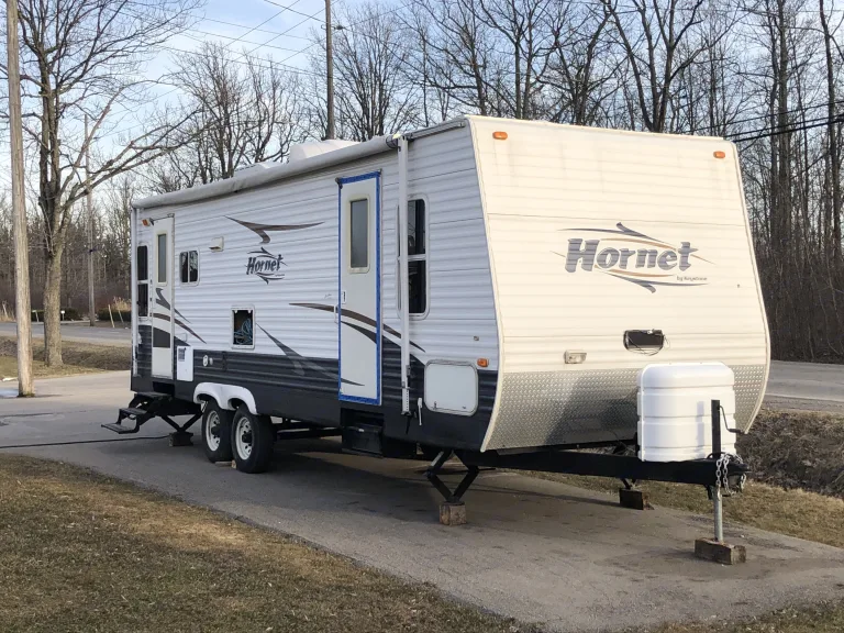 27 ft camper is perfect to get away. Has queen pillow top in the bedroom. Table turns to single size bed and has a pullout couch. Has AC. Heat. And a 30Amp hook up.