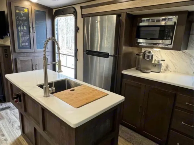 This camper is large enough that even on rain days it’s still comfy to hangout and play some cards inside or snuggle up on the pullout bed in the living room to watch a movie.