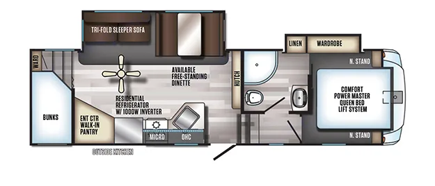 5th wheel with forword master suite, queen size bed, bathroom, shower, ceiling fans, dining area, 2 rear bunk beds, walk in pantry and a sofa in the living room. Nice big awning. 2 outdoor showers. Delivery and setup available for $2.15/mile from Hanford, CA.What's includedLinens, dishes, coffee pot, silverware. Bring you’re own clothes!