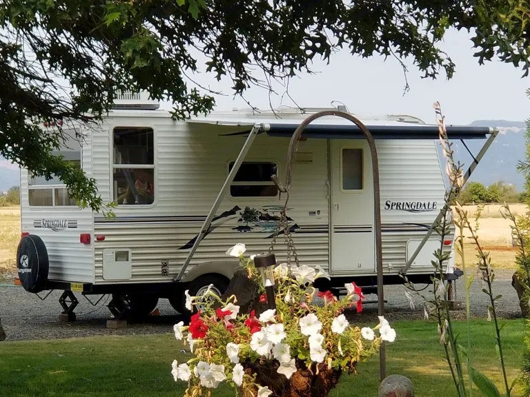 offers you everything you need to enjoy a relaxing vacation. Bbq, outdoor table, outdoor rug, wine bottle opener, pots and pans, plates, glasses, silverware and more. We have converted the full size bed to a queen bed, you will feel like you are sleeping on a cloud on the Costco memory foam mattress. The dining table lays out to an 8 foot bed, the width of the trailer unlike most table to bed RV's, and could sleep two little peeps. Come enjoy a weekend of fun in our cute little 18 foot travel trailer! We are only 20 minutes from Eugene, 30 minutes from Albany, 1 hour from Florence and 1 hour to Roseburg. You will need a 2 5/16 ball. Please see pictures for brake connections and weight limits.What's includedYou will have a clean sheet, so bring your own bedding. We have 2 chairs as well as some little side tables.Other things to noteMake sure black and grey tanks are emptied as you received it. Please provide a receipt showing dump fees if not camping at a full hookup site. Please provide a receipt showing propane tanks have been filled. Otherwise a fee will be incurred. See check out sheet for fees.