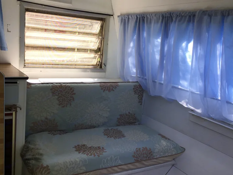 This is a Scamper trailer we bought and fixed up a bit with new pain, new floor and new linen. It has a fridge, oven and stove and sink. There is sleeping for 2 adults 6'2" or shorter and a kitchen seating area. Big closest for storage.