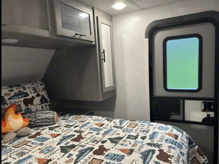 Hello and Thank You for your interest in our RV. The Coleman Lantern 2755BH Travel Trailer features a bedroom with Queen size bed with a sliding door to ensure privacy. The main living area features two bunks and both the dinette and sofa transform into beds for your camping needs. The RV also features an On-Demand hot water system to ensure long-lasting hot showers after a long day at the campsite. To make your stay as comfortable as possible the basic kitchen essentials are included; Keurig, pots/pans, dinnerware, cooking utensils, and silverware. If there is anything else in addition you may need please do not hesitate to ask and we would be happy to help accommodate your requests. We look forward to meeting you and getting your vacation off to the best start.
