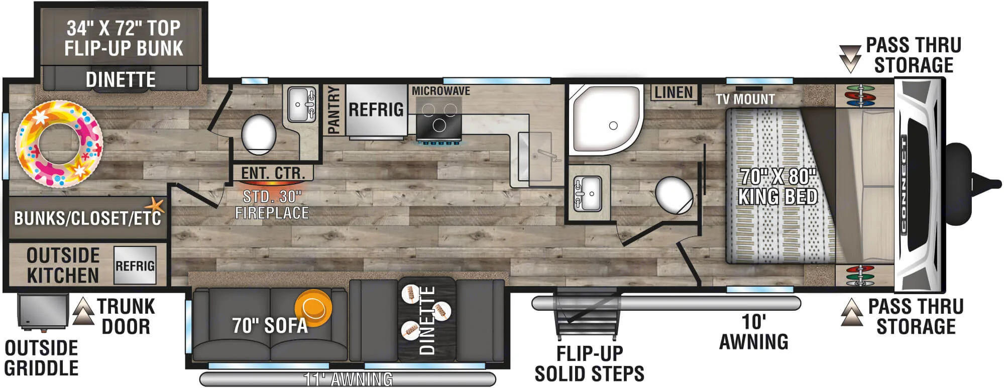 This is the ultimate RV to get away in! It's perfect for the whole family. With a separate bunkhouse and half bath for the kiddos, it's easy to have some alone time. Living area does have an electric fireplace for the cooler evenings or even just a glass of wine with your significant other. Two air-conditioner units to keep you nice in cool in the Texas summer sun! Roku TVs in all the bedrooms and living area, outdoor speakers for outdoor dancing, and an outdoor kitchen so you don't have to go in for a refill!Must have a 3/4 truck to pull this RV.What's includedCookware, Utensils(for 4), and multiple board games are included.Other things to noteNo Pets!