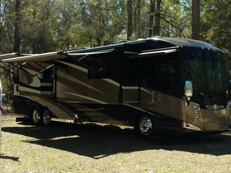 Absolutely beautiful coach. Everyone raves about it . You will surely feel it is your home away from home. More spacious and better amenities than a suite at a hotel, and who wants to have strangers right on the other side of the wall anyway? Sit back in the recliner with your morning coffee by the electric fireplace while taking in the view through the large panoramic windows. Hit the beach and then come back to your own bathroom and shower right on site. No more public bathrooms. Speaking of public stuff, how about the ultimate tailgate party with grill, outdoor refrigerator and TV to watch the pregame excitement. Treat the family to a great meal in the full size kitchen, with stove, microwave, convection oven, residential size refrigerator and yes, even a dishwasher. All pots, pans, cups, plates and silverware provided. Settling in for the night after a day of adventure ? Pull down the shades and kick back on the spacious couch to watch a movie on the big screen TV. Or better yet, close off the master bedroom, with the slide wall for privacy for mom and dad. This is quite literally a house on wheels.