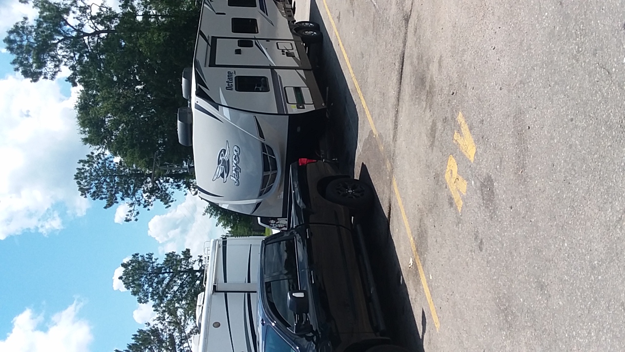 Toyhauler, bumper pull , deck, 2 ac, separated a.c. in bedroom, always seven to nine. Carry your toys. It's new. 2 king beds . Taller so no bumping your head. Generator. Holds lots of water. Electric and gas heat pump. Propane with quick connect for outside cooking. Outside shower. Deck with pull down screen so bugs can't get in. Lightweight for the size. Bring your toys or use it to move. Perfect with three king size beds. Stereo for inside and out. Easy to clean. Almost cant mess up it so nice and tough. Can take toys in also cause its a toy hauler. Fits my motorcycle and jetski at same time. Has tall ceilings and fold up couches. The owner is a noce guy. I follow outdorsey s allowed