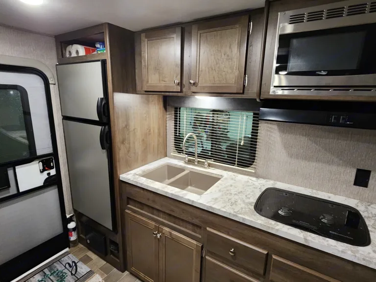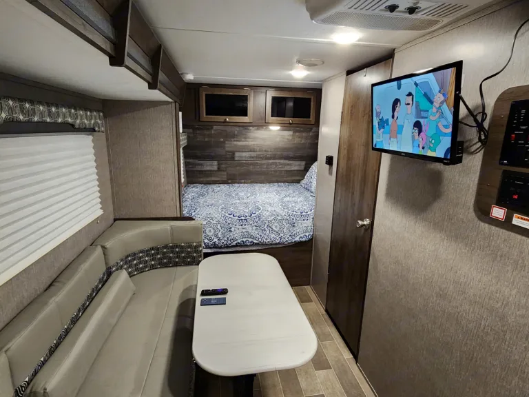 Cozy, spacious, and cute camper that will meet and exceed all your needs for a weekend camping trip or a road trip. Sleeps 4 with a queen-sized bed with a very comfortable memory foam mattress, sheets comforter provided. The camper features one slide out that extends the dining area and the dining table folds down into a full sized bed with full sheets and blankets provided. The dining area also has a 24in Roku TV that will connect to Wi-Fi and any Hdmi devices. The Bluetooth audio system can be used both inside and outside and works very well. The bathroom is a full bathroom with plenty of space, stand up shower, vanity, and toilet. Don’t like taking cold showers? Don’t worry, because the water heater is a life saver! The air conditioner is an overhead central air system that will work only if you’re planning to stay at a full electric hookup site. During the winter months the propane heater will keep you nice and toasty. The kitchen has a double sink with very good water pressure and a gas stove top. Cooking utensils and pots and pans are all provided along with a 5-cup coffee maker. The fridge is not your normal camping fridge, very spacious and works very well. There is plenty of cabinet space to store anything you could think to bring on your camping trip. Outdoor awning extends to provide a very big picnic area that will keep you both dry and out of the summer sun. All hook ups supplies are provided, and we will help you and teach you how to set up and wrap up. This camper is very easy to tow and is perfect for any first-time campers, hitch is provided. Can hook up to both 50-amp and 30-amp sites. Pets are welcome but with a 2-pet minimum and 50lb weight limit, if your pet damages anything you will be expected to pay for any damages. Kids are welcome as well but please be respectful of our property, remember this is not a hotel, we use this camper as well.