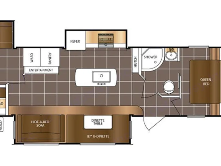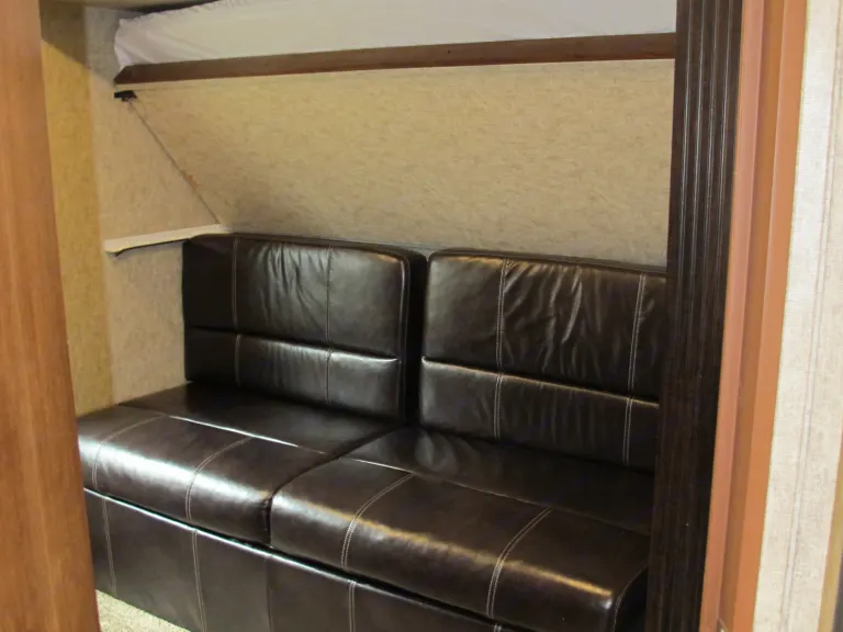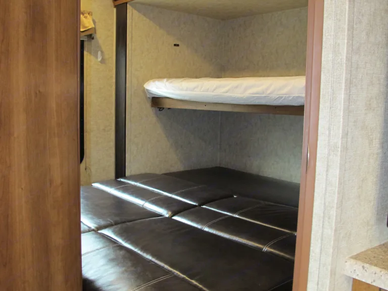 Sleeps 8 to 10. Two single bunk beds in the back, and a pull-out sofa. The social area has a pull-out sofa, TV/DVD player, Radio/Bluetooth audio with indoor and outdoor speakers. Large dinette converts to a double bed. Queen bed in the master bedroom, with door up front for privacy along with wardrobe space.