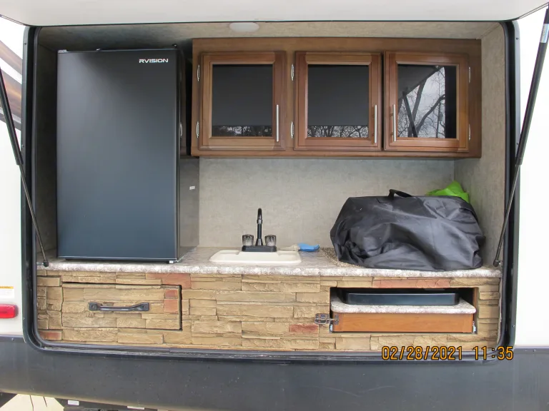 Electric awning with LED lights and an extra outdoor kitchen with stove burners, and fridge.A 3/4 ton truck or larger is required to tow this camper. If you do not have a suitable vehicle, delivery is available (Contact me for delivery pricing). I will deliver and set up the RV on your campsite. At the end of the rental period I will pickup the unit and take care of dumping and refilling the the propane tanks. When booking the unit with delivery, choose stationary rental for a less expensive insurance rate.What's includedRentals include cookware, utensils, dishes. A toaster and Kuerig are also provided. Outdoor kitchen includes a refrigerator and two-burner cooktop.