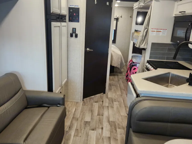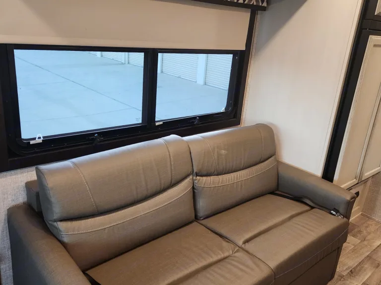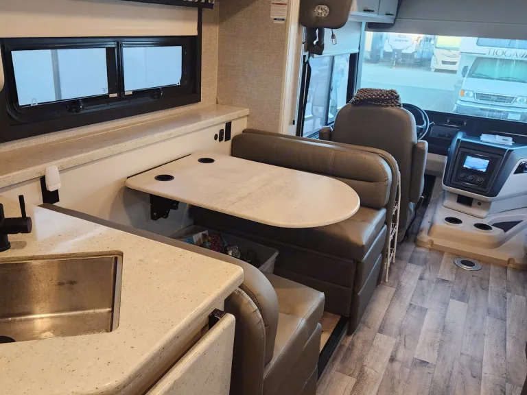 Enjoy your next road trip in style with this beautiful new motorhome. Whether your Vision is to travel the countryside with your spouse or take weekend trips once a month with your family, this coach offers plenty of conveniences and cozy comfort to stay inside all day! From the private rear corner bedroom with a queen-size bed slide for more floor space to the rear corner full bathroom to keep you refreshed for whatever is next. You can relax on the sofa or at the booth dinette (both can also be used as a full-size bed at night) and watch the 39" LED TV on a lift. Or while you are exploring during the day, be assured you can return to cook a homemade meal using the kitchen's amenities including an 8-cu. ft. refrigerator and a 3-burner stove. The cockpit table offers another space to set your morning coffee. Outside, the 18' electric awning provides an outdoor area to relax after grabbing your camp chairs from the pass-through compartmentWhat's included• Cookware & utensils
