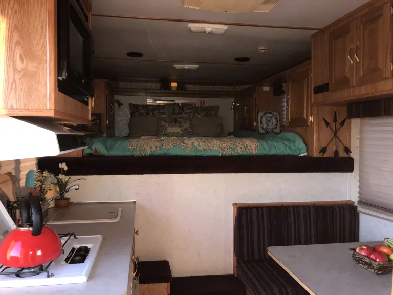 Our trailer is a combined horse trailer with living quarters. A queen size bed with a twin bed that also converts to kitchen cushioned bench seats and a table that pops up. It has a sink, stove, and refrigerator along with full bath with shower, sink and toilet.