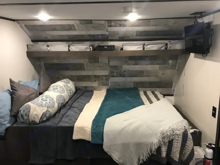 Snuggle up in this cozy camper for your next outdoor adventure! Brand new model with all the amenities, perfect for a couple’s get away or a family retreat. Comfortably sleeps 5 guests with a queen bed, two bunk beds, and a dinette that converts into a bed. Please review the list below to know what you will need to provide and if you have any questions feel free to reach out.Facilities Included: