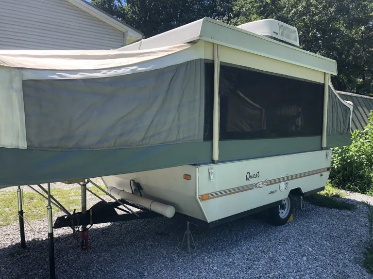 Pop up is good condition for its age! Has ice cold AC, where 30 amp hook up is available(I do provide a 30 amp/110v adapter). Convenient pick up location near Asheville/Hendersonville for WNC camping experience.Requires 2” ball to tow, 4 prong for lights(though I have an adapter for 7 prong).What's includedClean Sheets for each bed and Velcro attached curtains found under dinette seats.