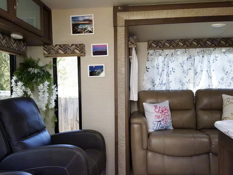 Brand New! Lottie (AKA Ella) has vinyl seating and a beautiful interior, a fold out full size couch for 2, a fold-down table for 2, and a private master bedroom with a queen-size bed. There's plenty of storage inside and out as well as lots of floor space when the slide is extended. The kitchen has a stainless steel sink and modern fixtures no corners were cut here. There is additional storage in the kitchen pantry, under the seats, and under the beds. You'll enjoy the grill that attaches to the rig with cooking tools under an L E D lit awning. There's a 32" TV in the living room with a wide range antenna to watch all your favorite shows. I supply all the kitchen towels, dishes, silverware, appliances & pots and pans. The stove, oven and refrigerator are propane and/or electric. The heater/AC units work great for your get-away. I supply all the sheets (for a $25 fee) and blankets unless you'd like to bring your own. There are 2 sets of bath towels as well.