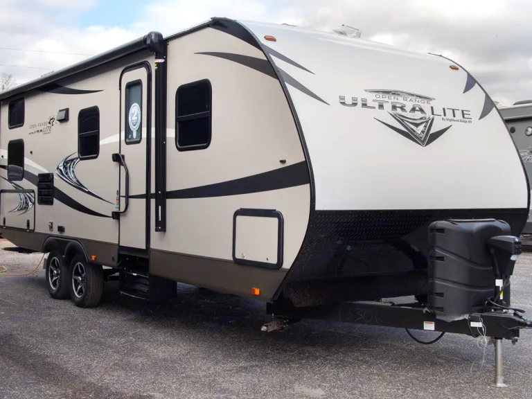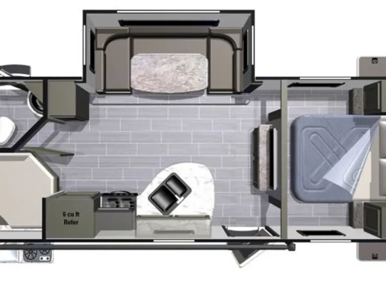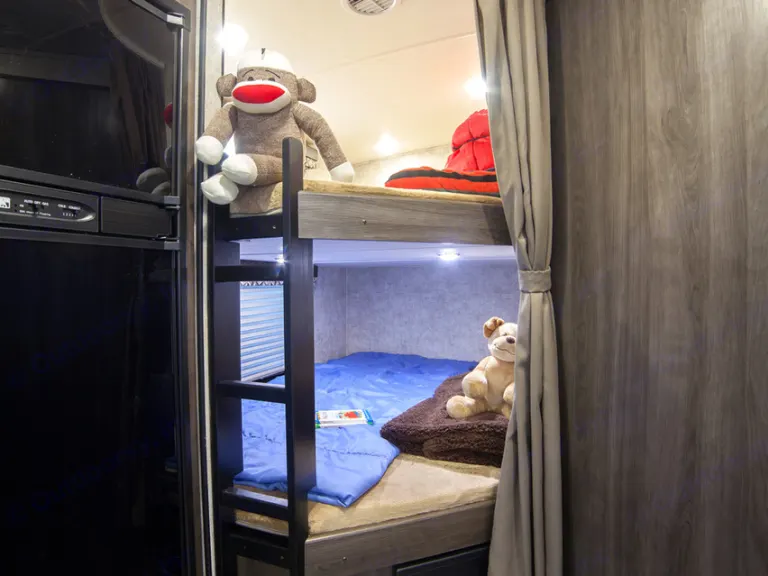 Step inside the main curb side entry and notice how open and spacious the combined dining and living area is. Enter the bedroom in front through sliding doors on either side of the entertainment center located on the interior wall in the living area. Inside the bedroom you will find a convertible queen bed with extension, dual bedside wardrobes and nightstands, plus overhead cabinetry as well.To the left of the main entry door there is a kitchen area where you will easily be able to prepare and cook food for the whole gang. Here you will find a double sink with plenty of counter space, overhead cabinets for dishes and things, plus a three burner range. Your food will keep fresh in the 6 cu. ft. refrigerator, and there is also a pantry cupboard for your dry and canned goods on the opposite side. You can also choose to use the pantry as a wardrobe if you like. The u-shaped dinette slide out allows room for meal time, playing games, or even sleeping space.The rear right corner features a convenient bathroom with a private entry to the outside on the road side wall. This is great when spending time outdoors, giving you easy access when you need it. The bath includes a shower, toilet, and vanity with sink.The opposite corner features a set of double bed bunks with a ladder for easy access to the top bed.The outside kitchen and exterior storage compartments come in handy on those beautiful weather days while camping in the great outdoors.