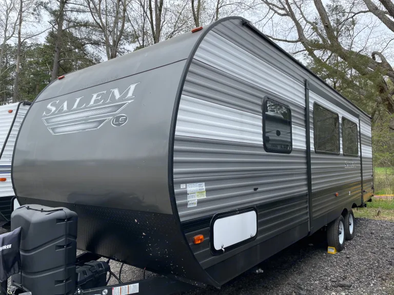 Your family of nine will be perfectly comfortable in this Limited Edition Salem travel trailer which features an extra-large panoramic window package providing you the view of your choice while seated at either the booth dinette or sofa. With the large slide fully extended, you will find that there is plenty of interior living space, and at night, you will find comfortable sleeping arrangements with the double-size bunks, a queen bed in the front private bedroom, and the booth dinette and sofa that can both be transformed into beds. The walk-in pantry is a plus for storing dry goods and snacks so that you can stock up for your weekend getaway! The power awning with lights is also a plus for enjoying a bit of outdoor living space on both a beautiful day, as well as at night.Plan to make plenty of memories with your family when you choose to camp in a Forest River Salem travel trailer! Along the exterior you will find helpful features such as an oversized pass-through storage compartment that will allow you to bring along more of what you love and true stabilizer jacks with J.T. Strong Arms to provide a firm and solid support for the Salem. The kitchens are sure to draw your attention with the 10.7 Everchill stainless steel refrigerator, the LG solid surface countertops, the residential designer spring faucet, and the stainless steel roll-up sink cover, and you will only find doors leading into the master bedroom, never curtains.